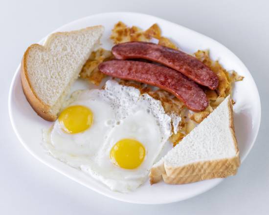 One Bavarian sausage and two eggs. Served with pan-fried potatoes and toast.