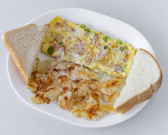 Filled with diced ham, green peppers, and onions. Served with pan-fried potatoes and toast.