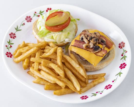 Served with bacon, fresh mushrooms, and cheese.