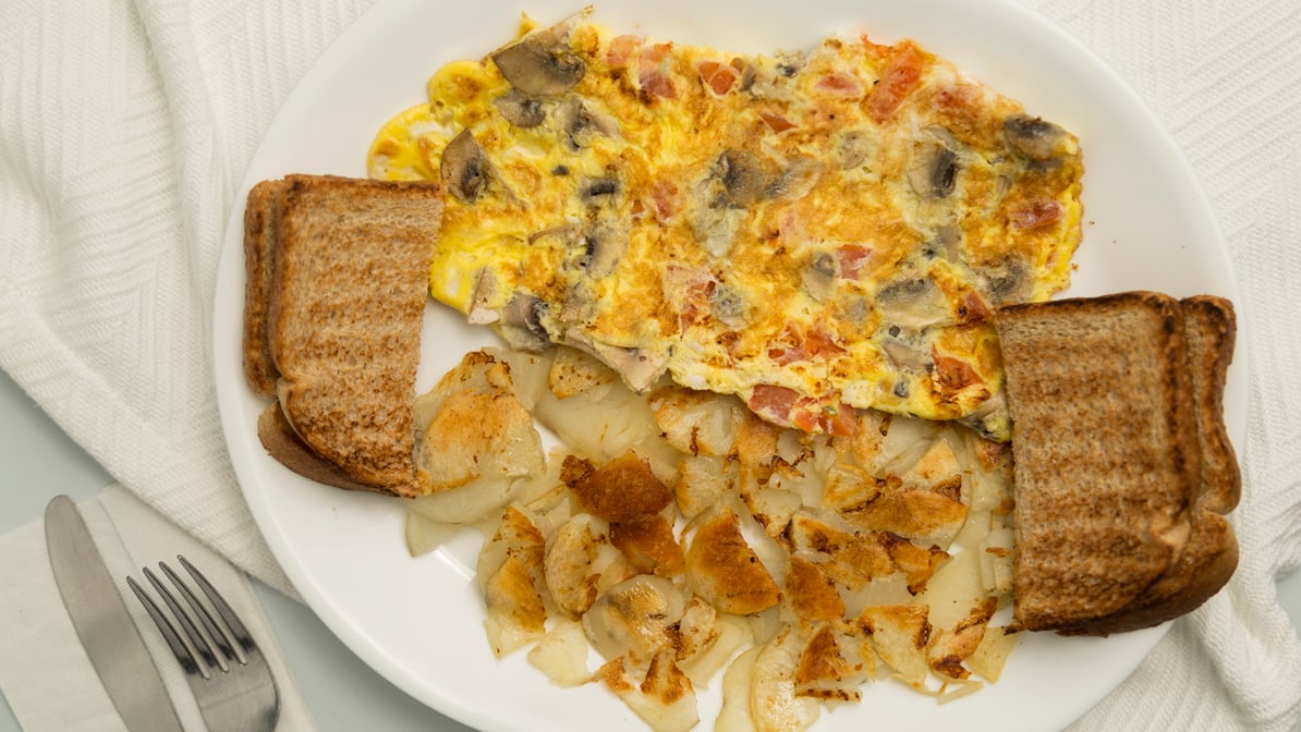 Filled with diced tomatoes, mushrooms, and Cheddar cheese. Served with pan-fried potatoes and toast.