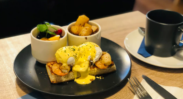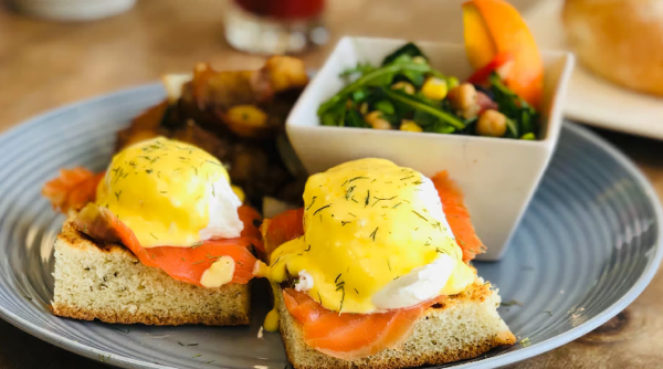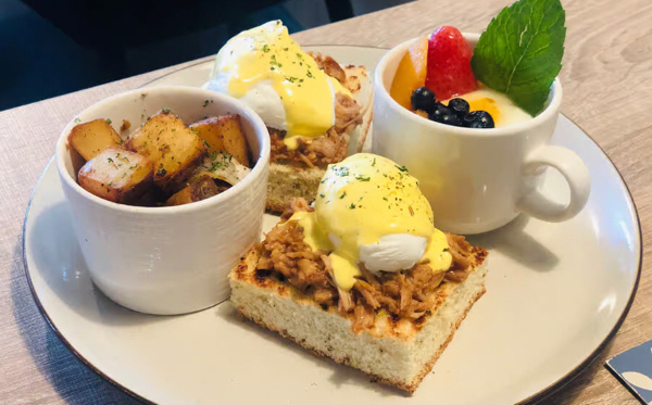 Grilled focaccia, 2 poached eggs, hash brown and hollandaise sauce, with a side of yogurt.