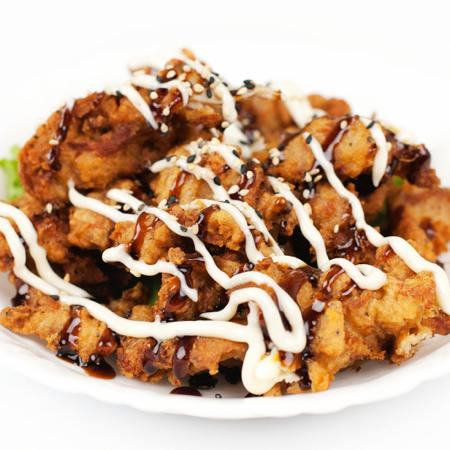 deep fried ball-shaped japanese snack flled with a piece of octopus, served with tonkatsu sauce and mayo