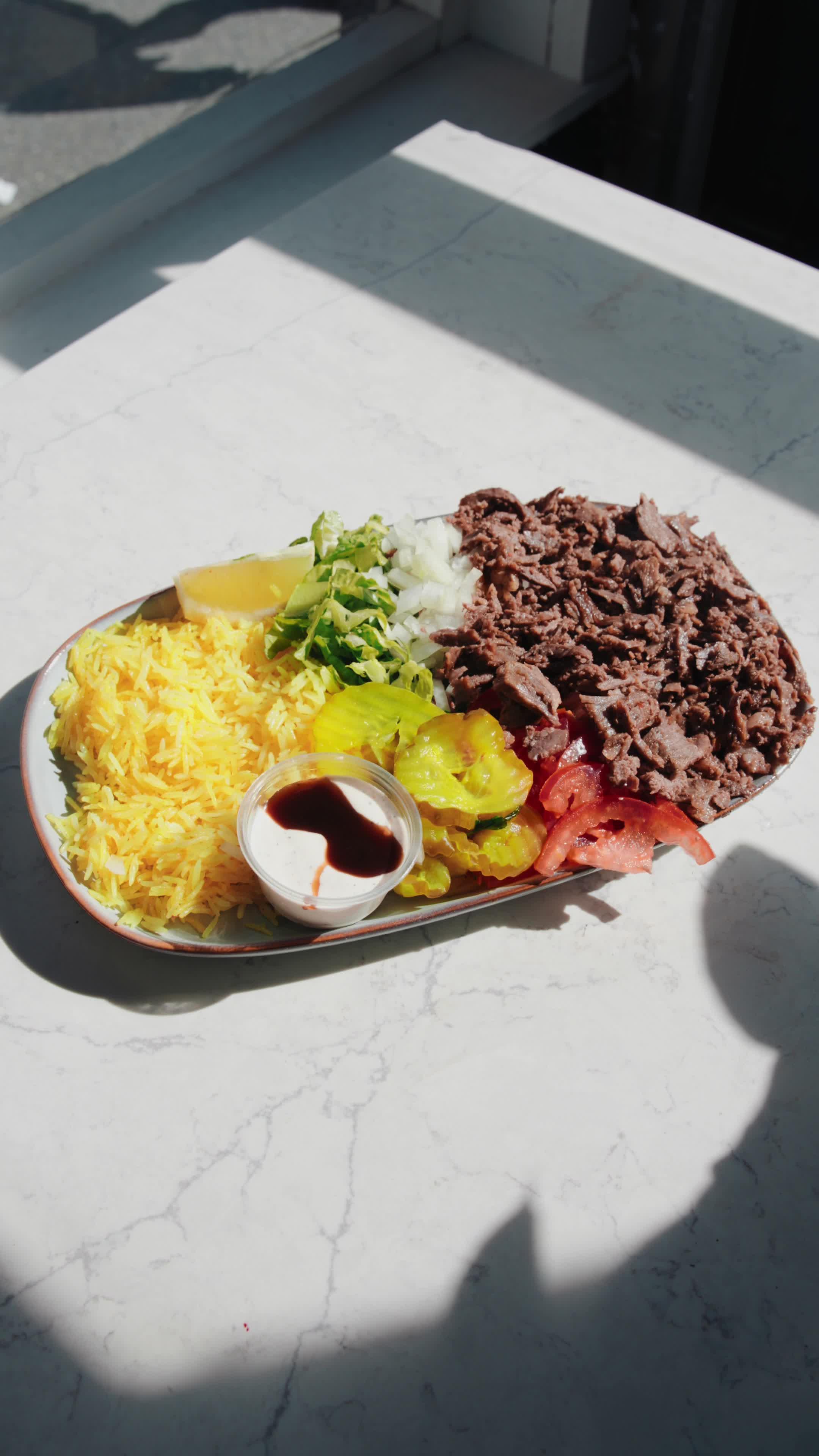 Marinated chicken, veggies & herbs, rice or bulgur, topped with signature sauces.