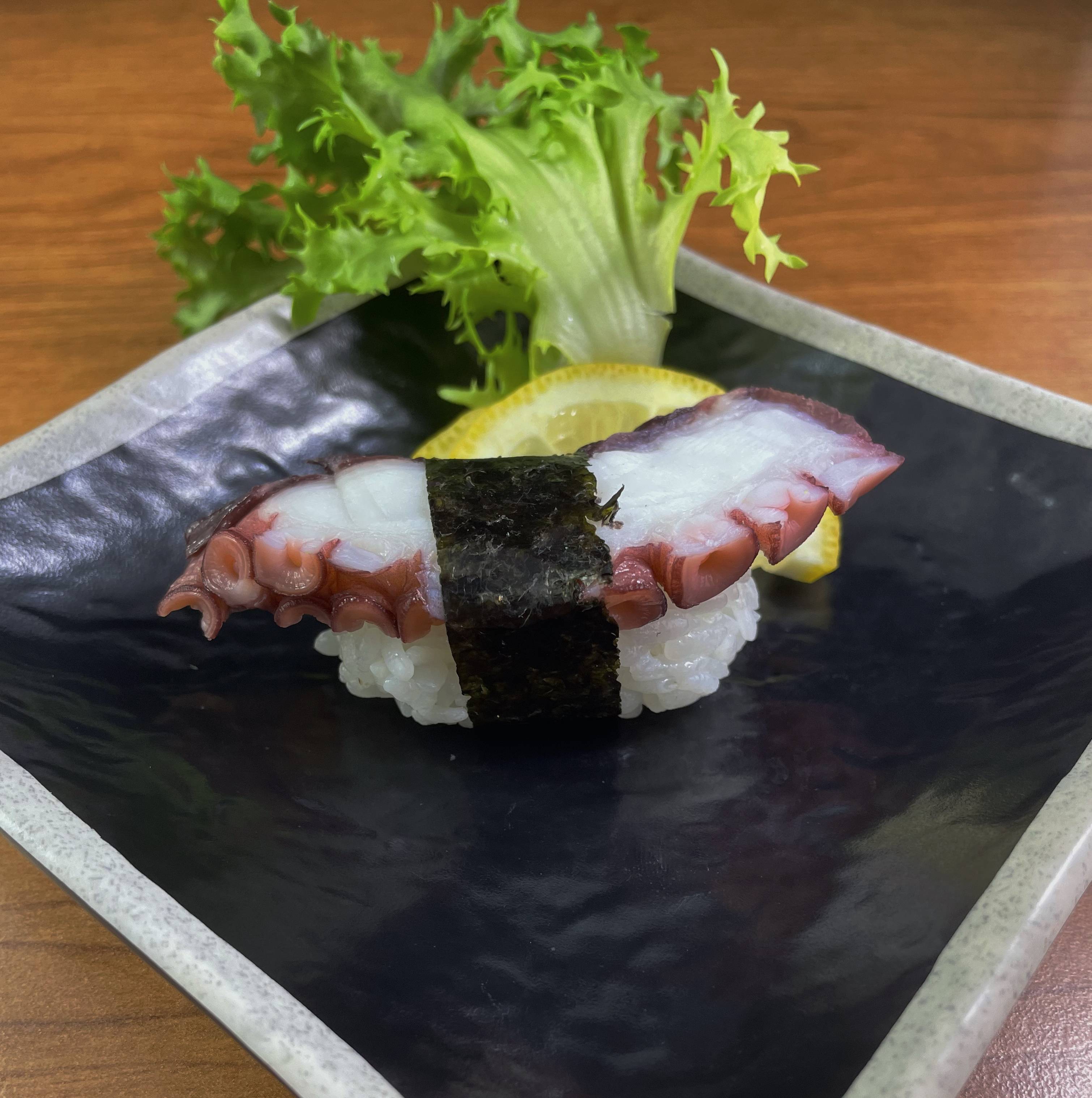 Salmon, Sockeye Salmon, Hamachi, Saba, Amaebi, Scallop, Tako, and Ikura on sliced radish