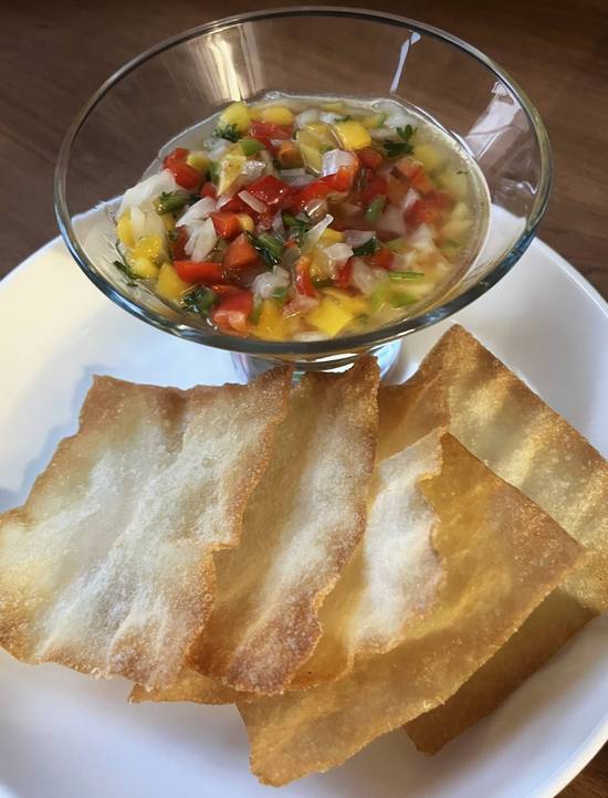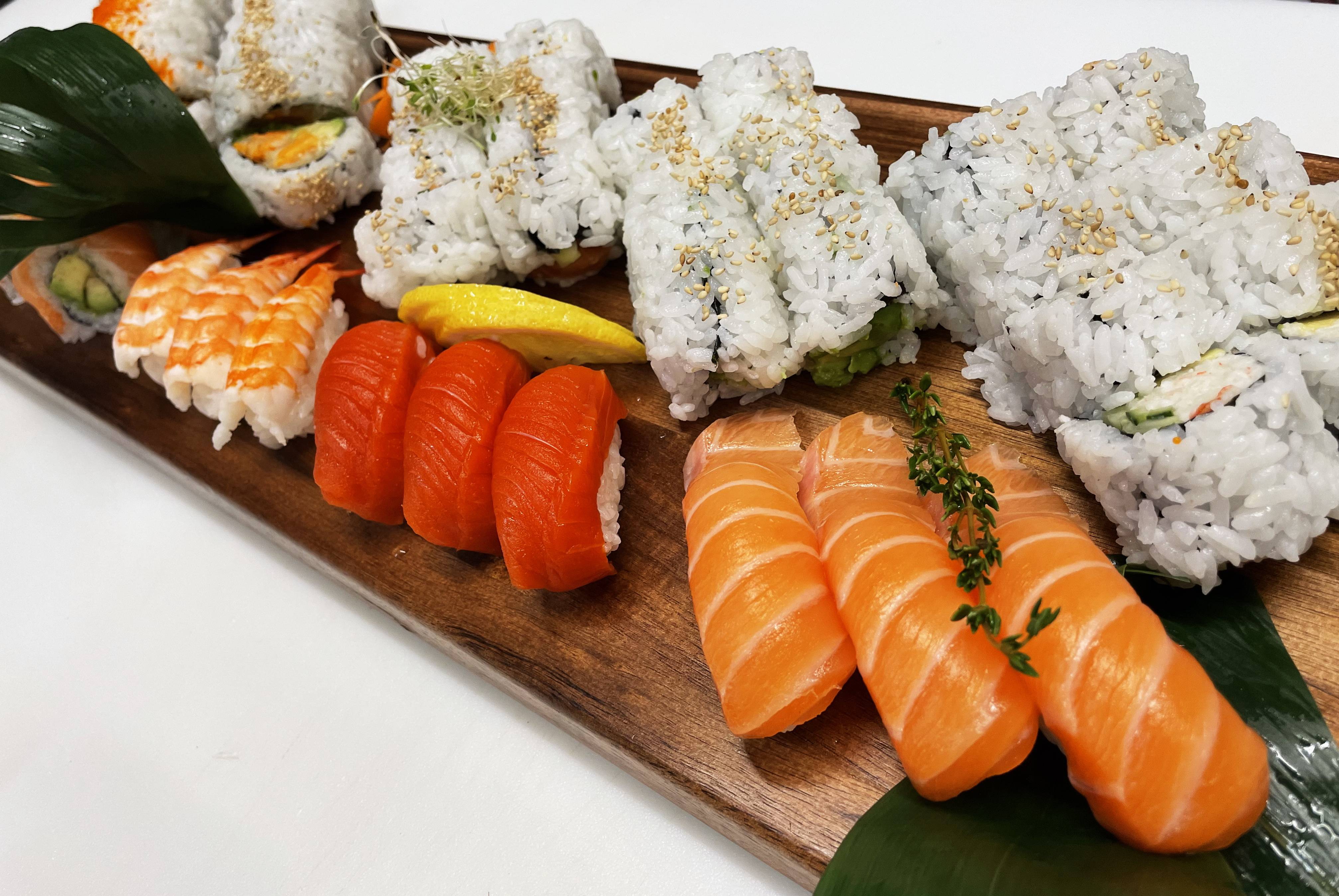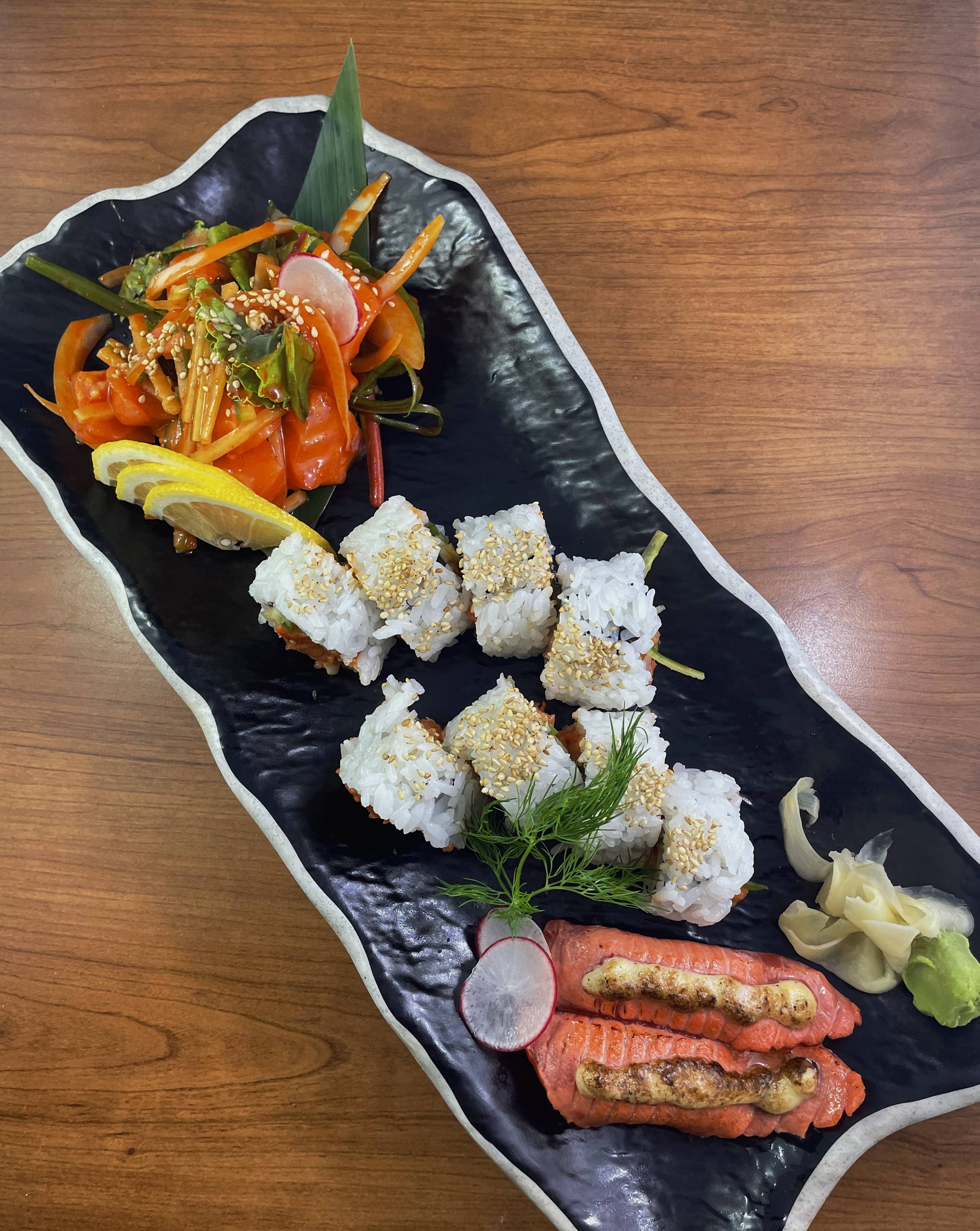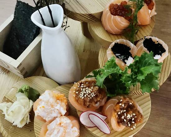 4 pcs Aburi Salmon gunkan, 4 pcs Ebi (shrimp) with masago gunkan, 4 pcs Spicy Salmon gunkan, Aburi Sockeye roll, 2 Salmon Avocado rolls. Served with 4 pcs deep fried Tamago sticks, 2 pcs Korokke, 2 servings of mango salsa and chips