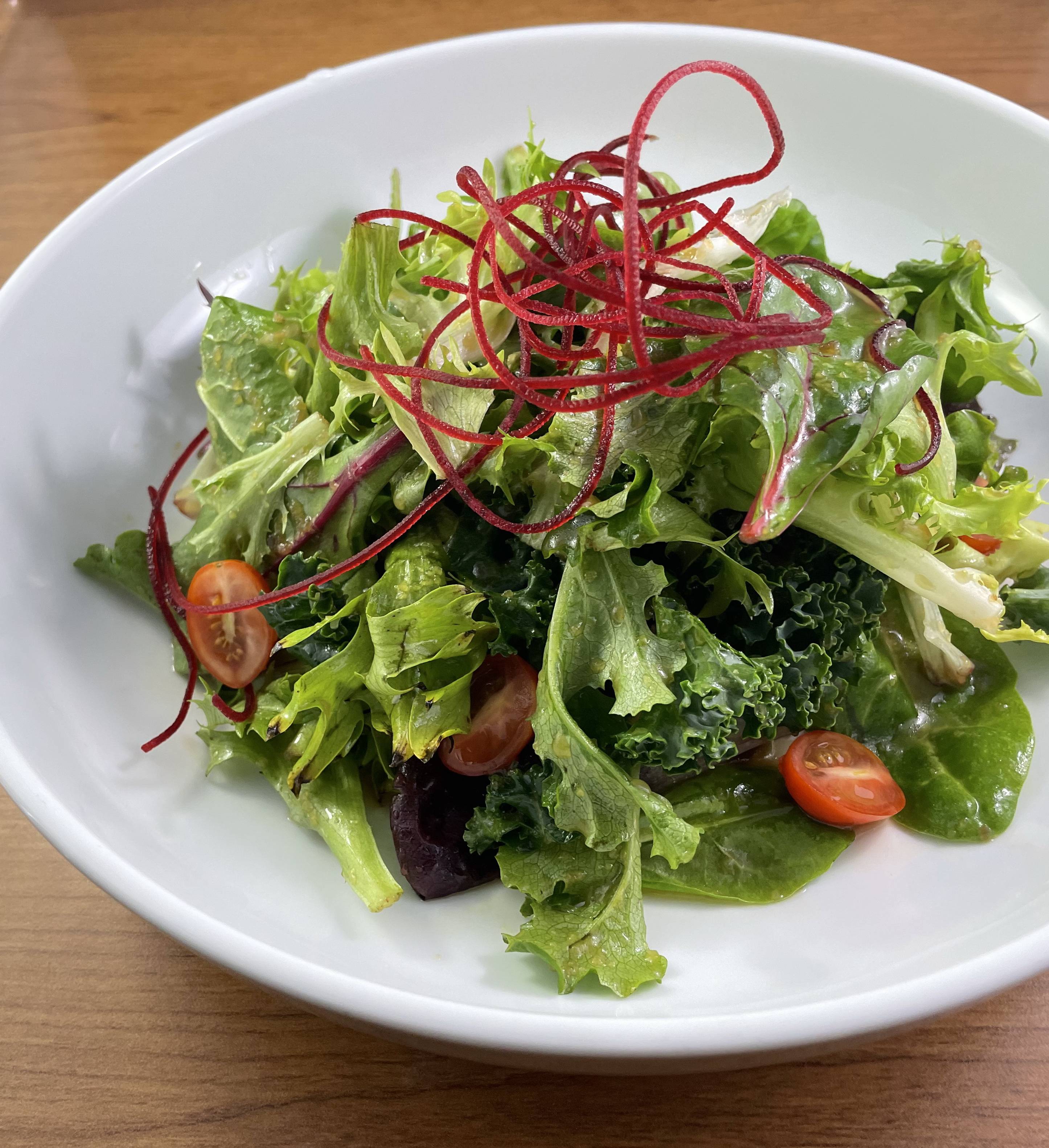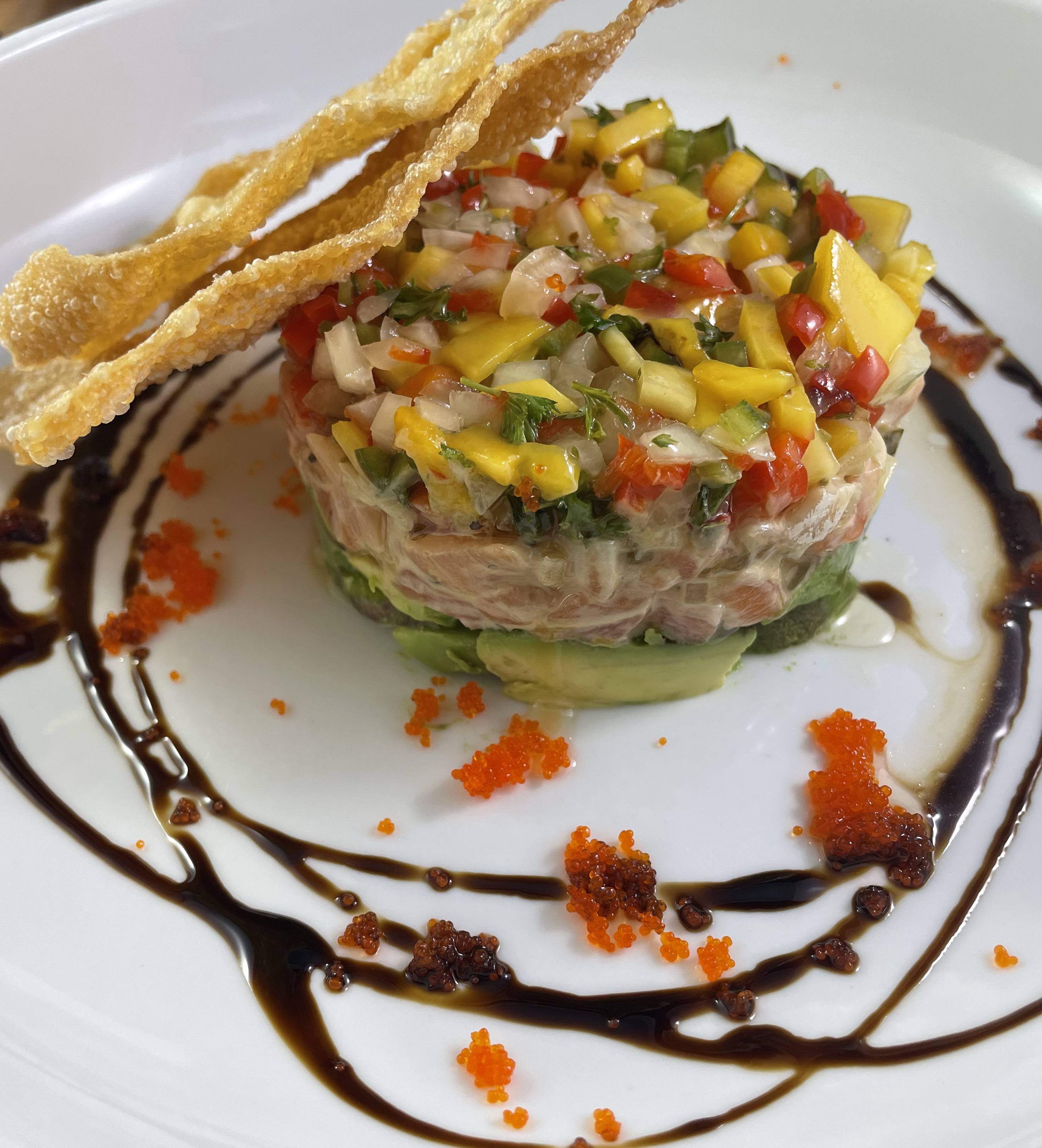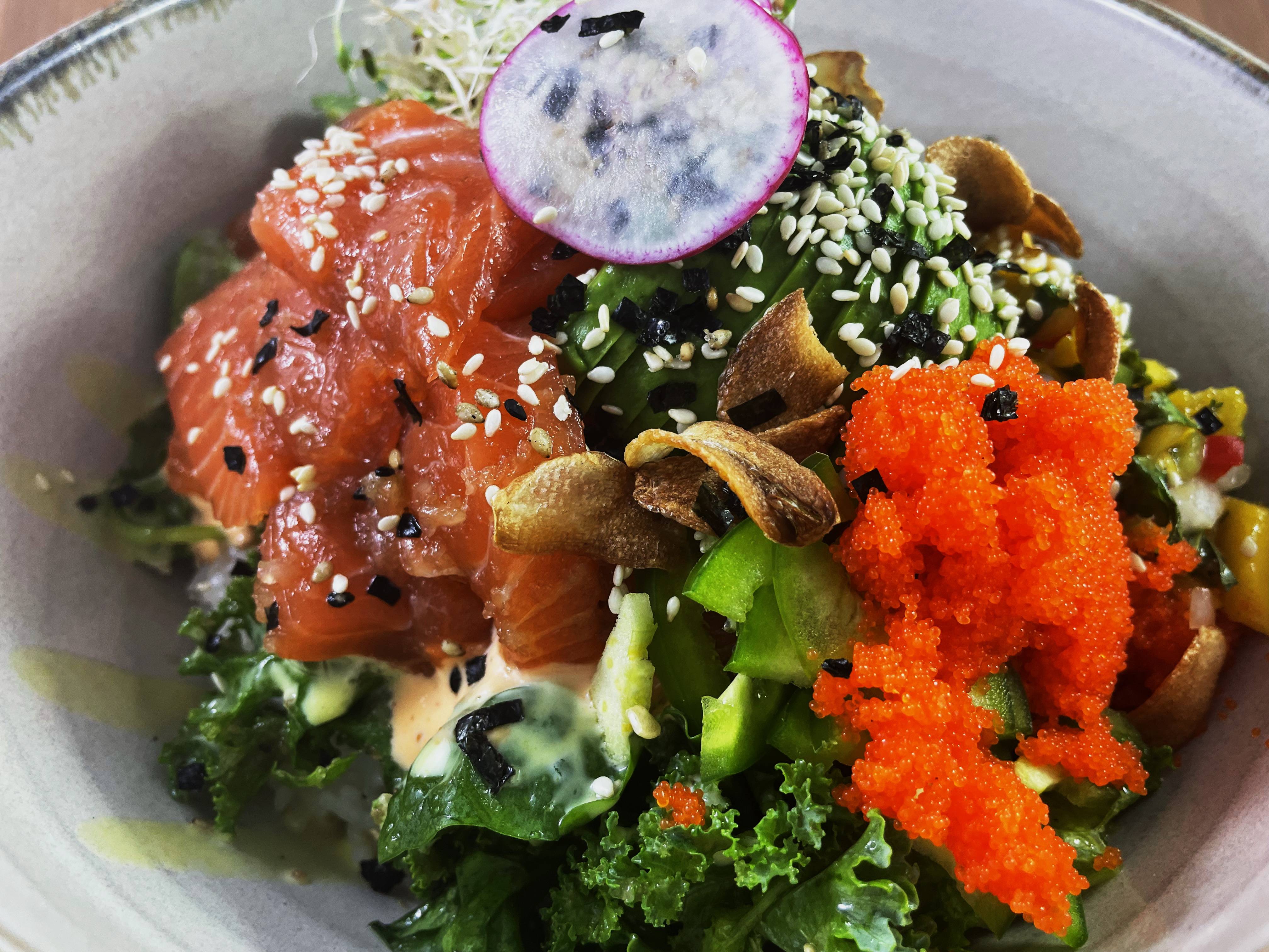 Salmon sashimi in asian soy sauce, mango salsa, seaweed salad, avocado, cherry tomatoes, and greens on rice with spicy mayo and honey mustard. Served with miso soup on the side.