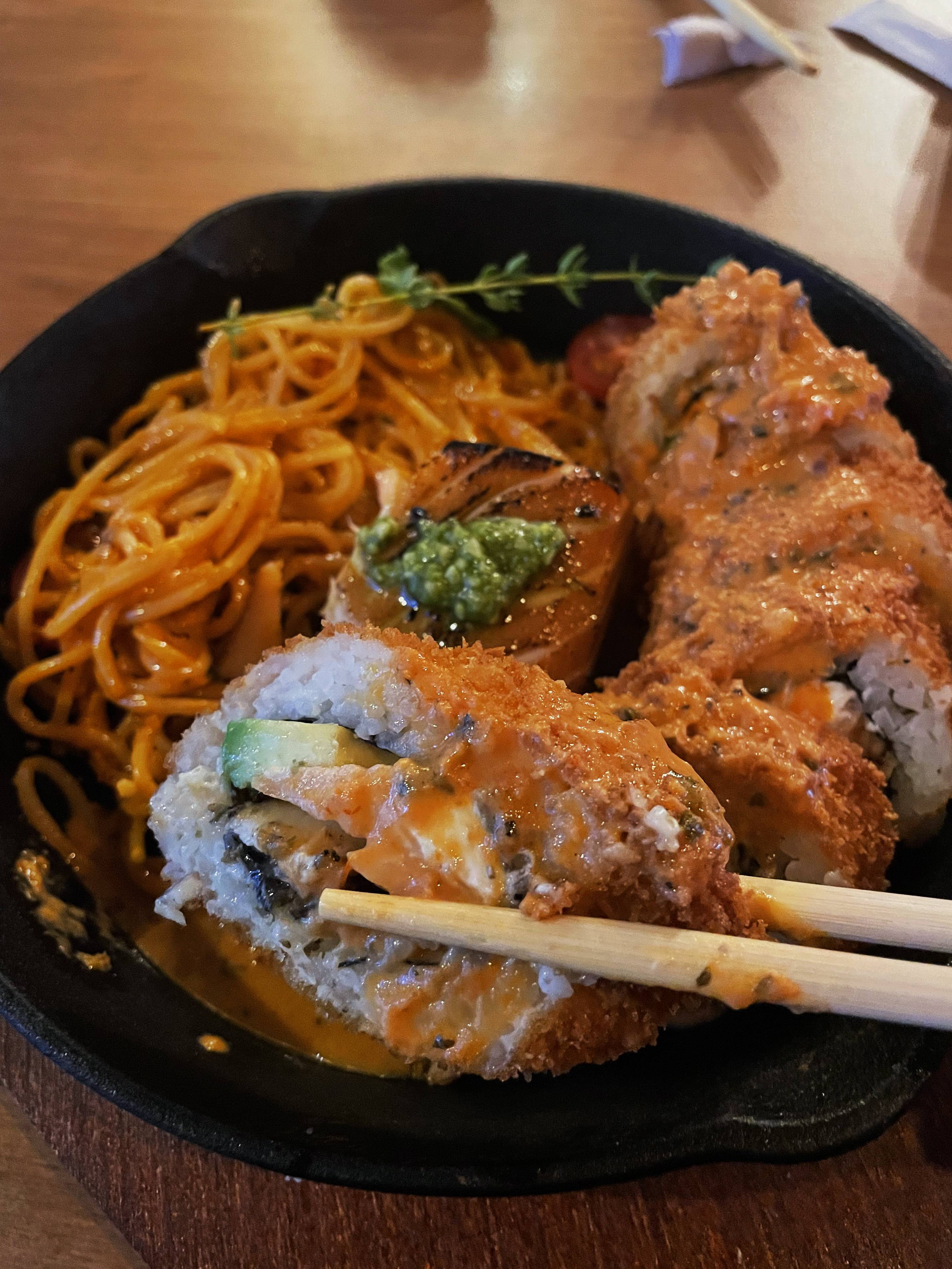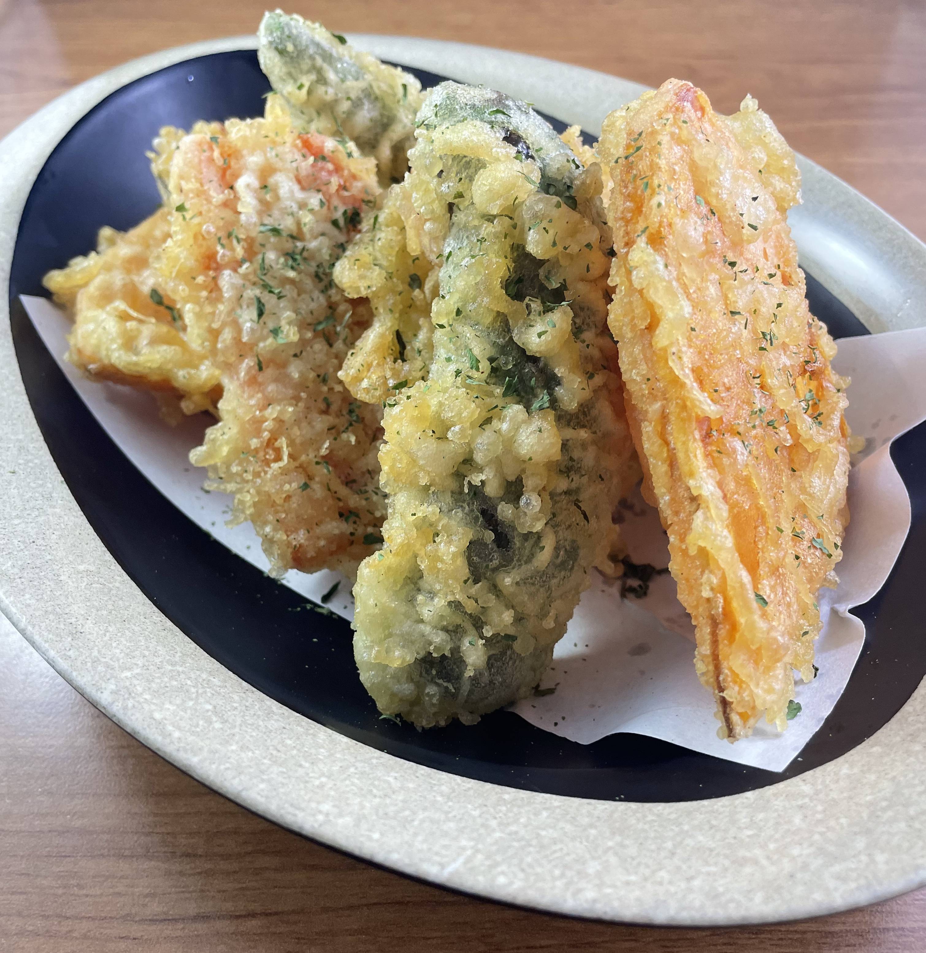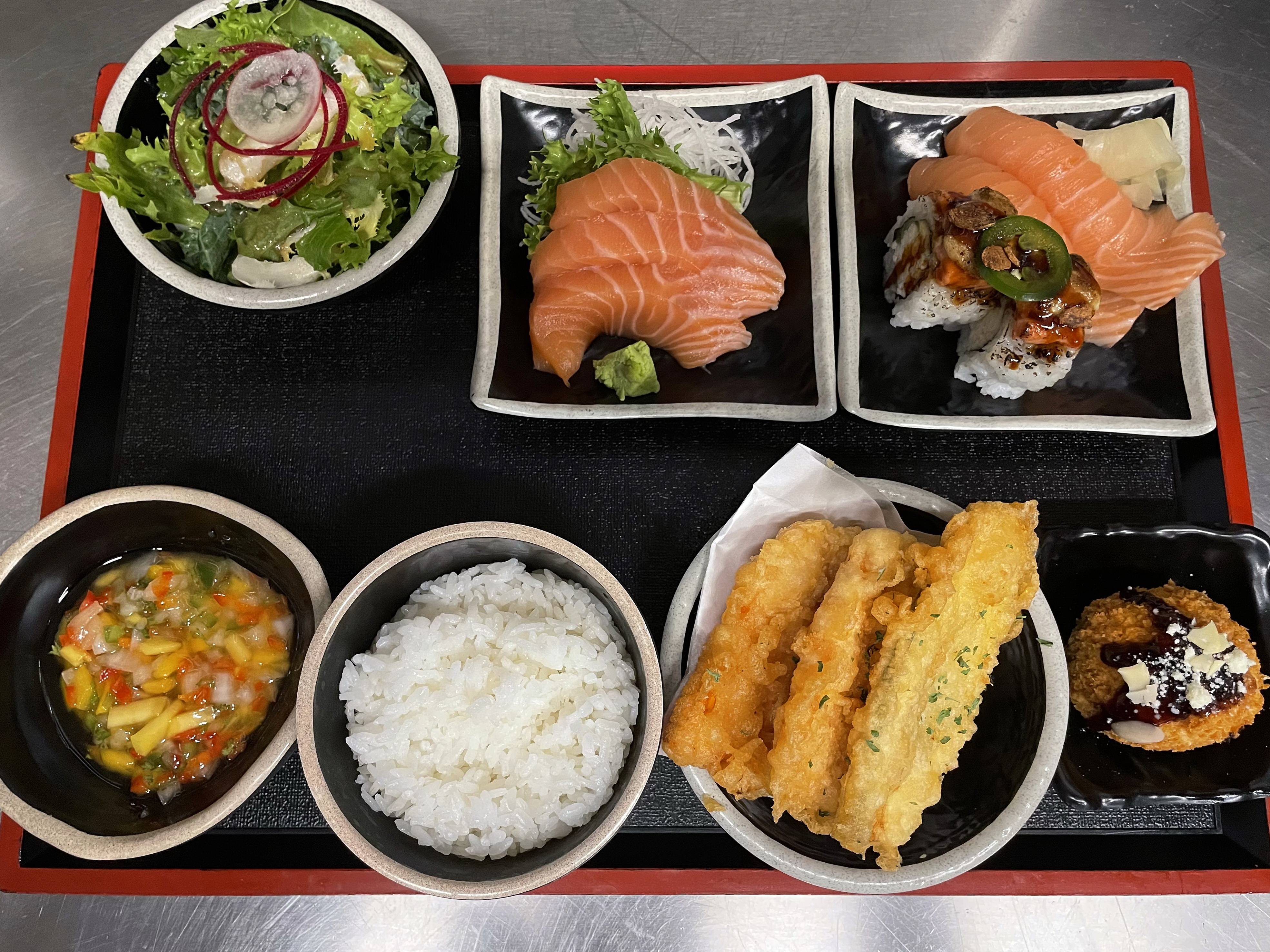 Include 2 pcs Aburi roll, 3 pcs veggie tempura (yam and zucchini) Comes with soft tofu with ponzu, house salad, rice and miso. 2 pcs Salmon gunkan and 3 pcs Salmon sashimi