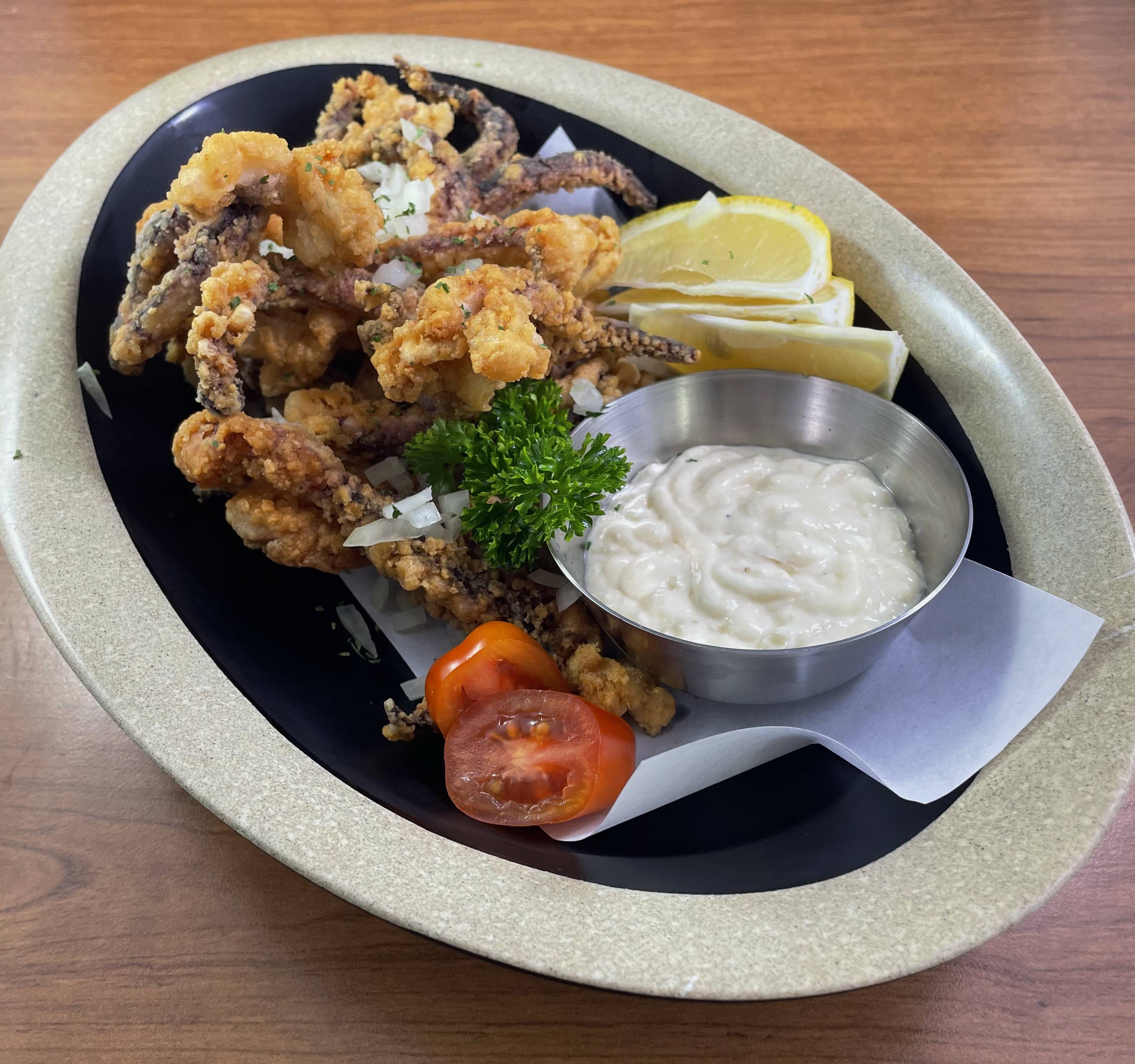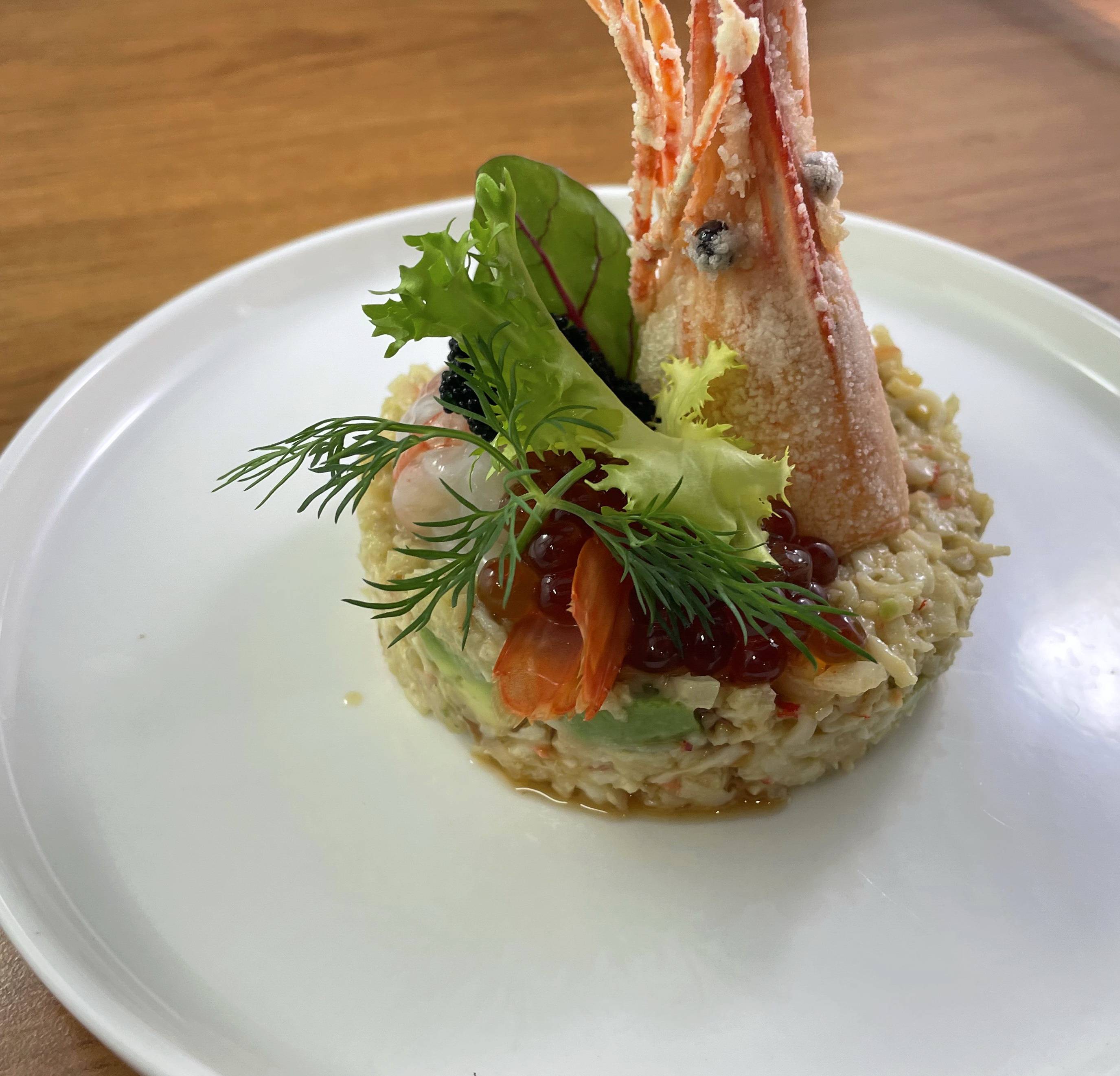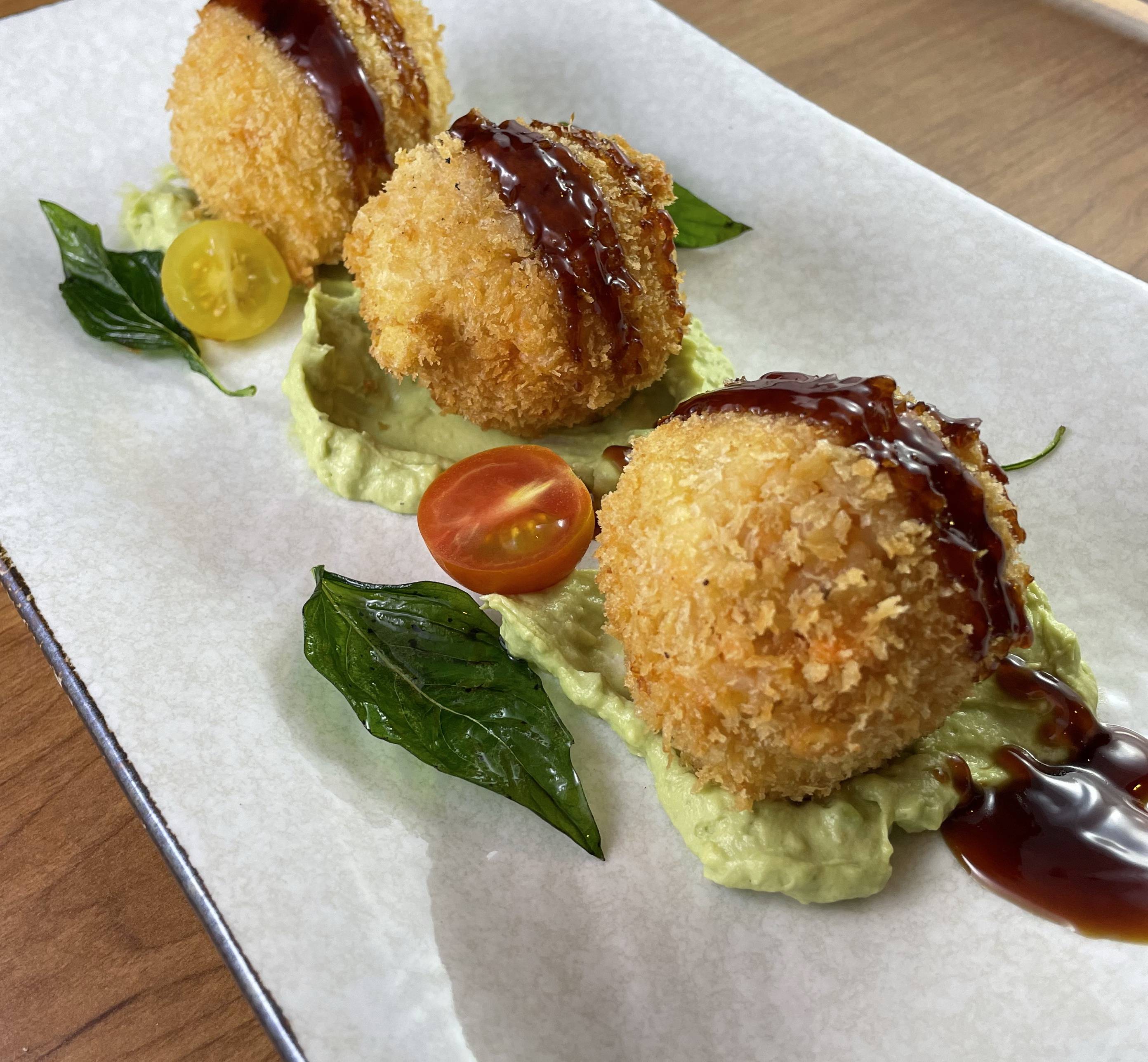 Two-piece deep-fried prawn, avocado, cucumber, and lettuce with thousand island sauce. Covered with masago (smelt roe) on top.