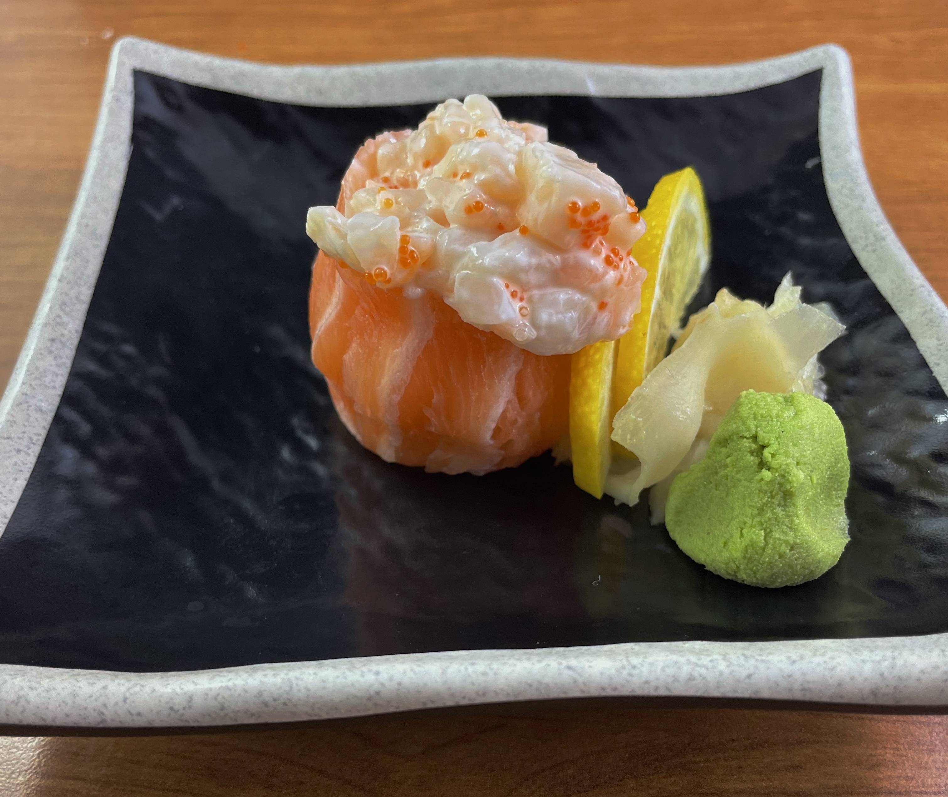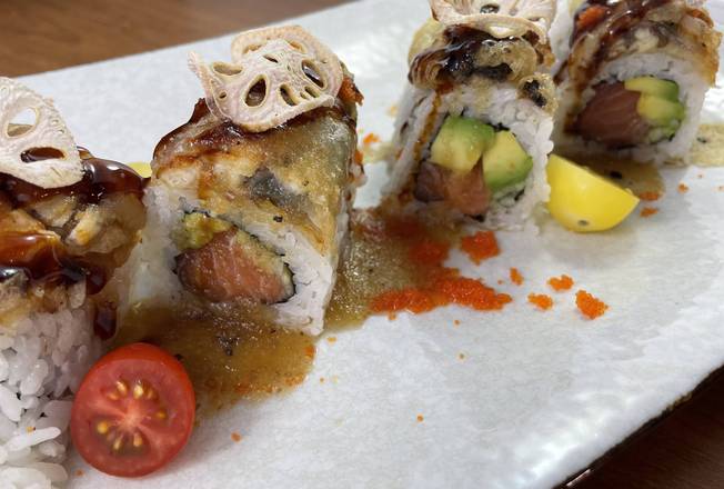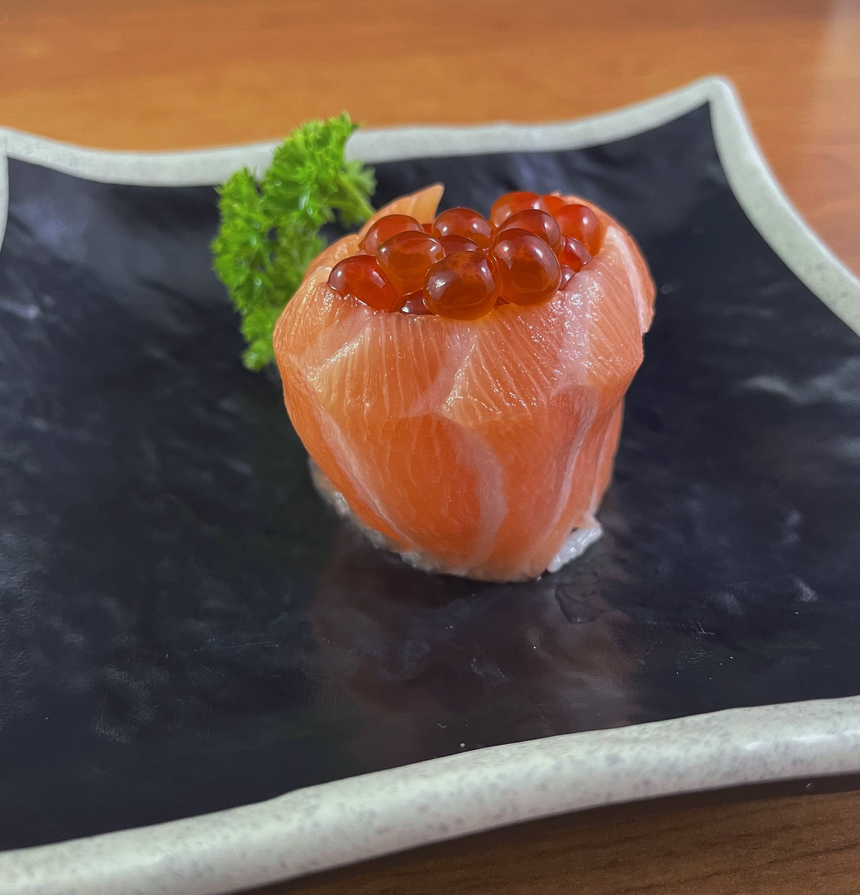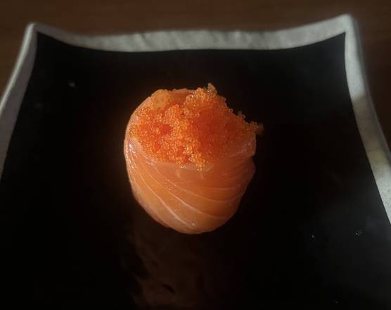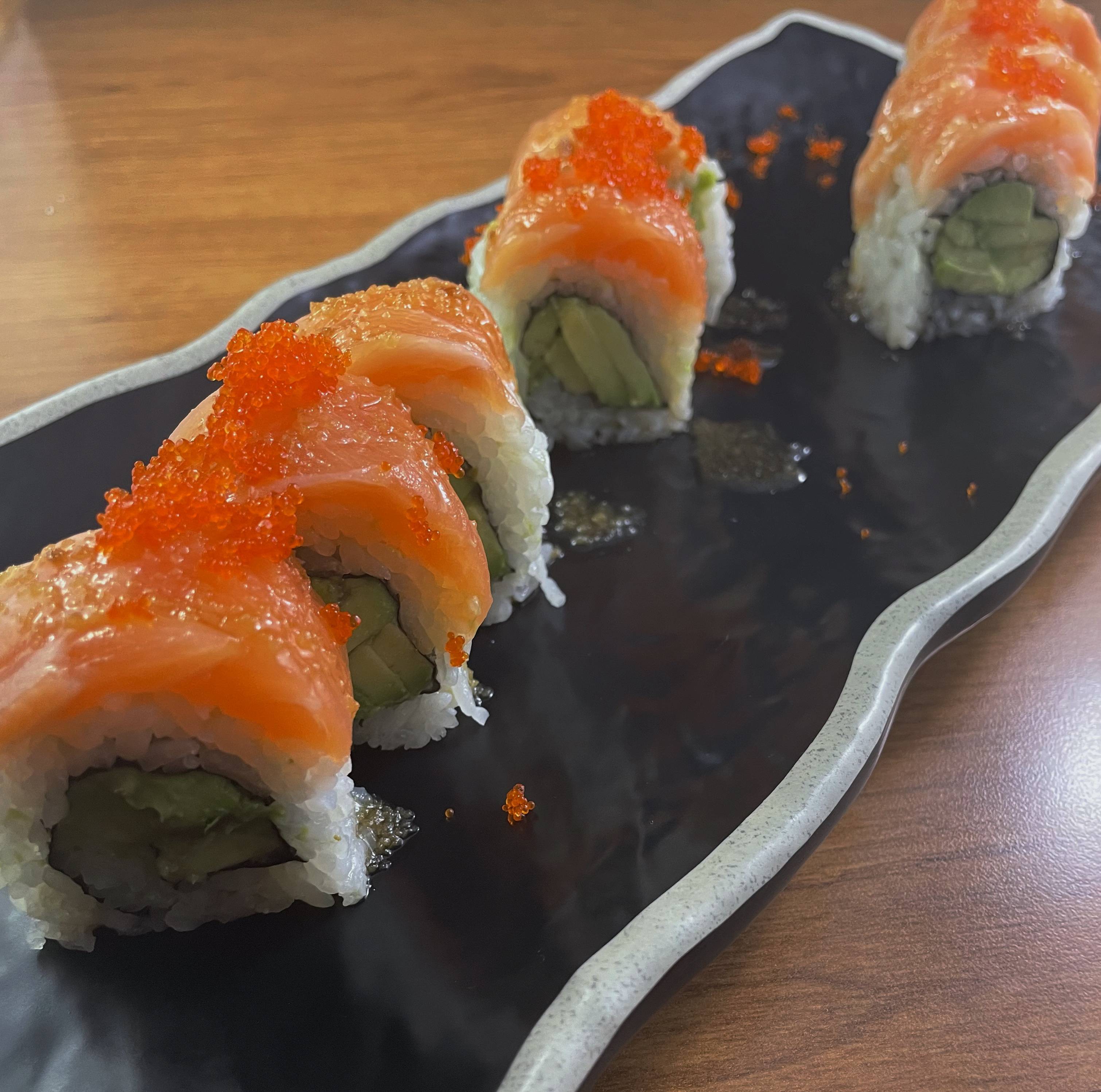 Avocado roll topped with salmon and house salad dressing covered with masago.