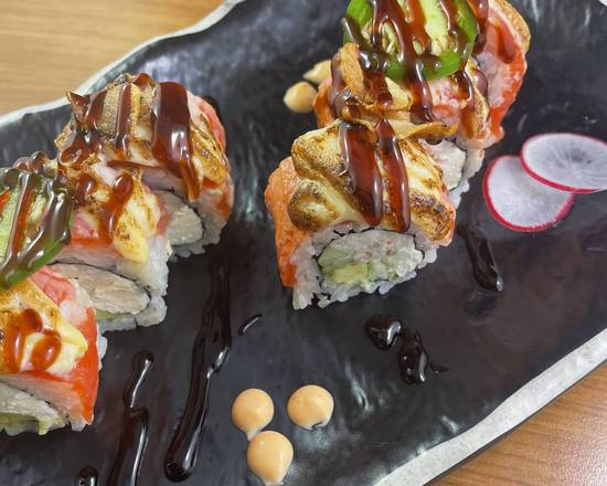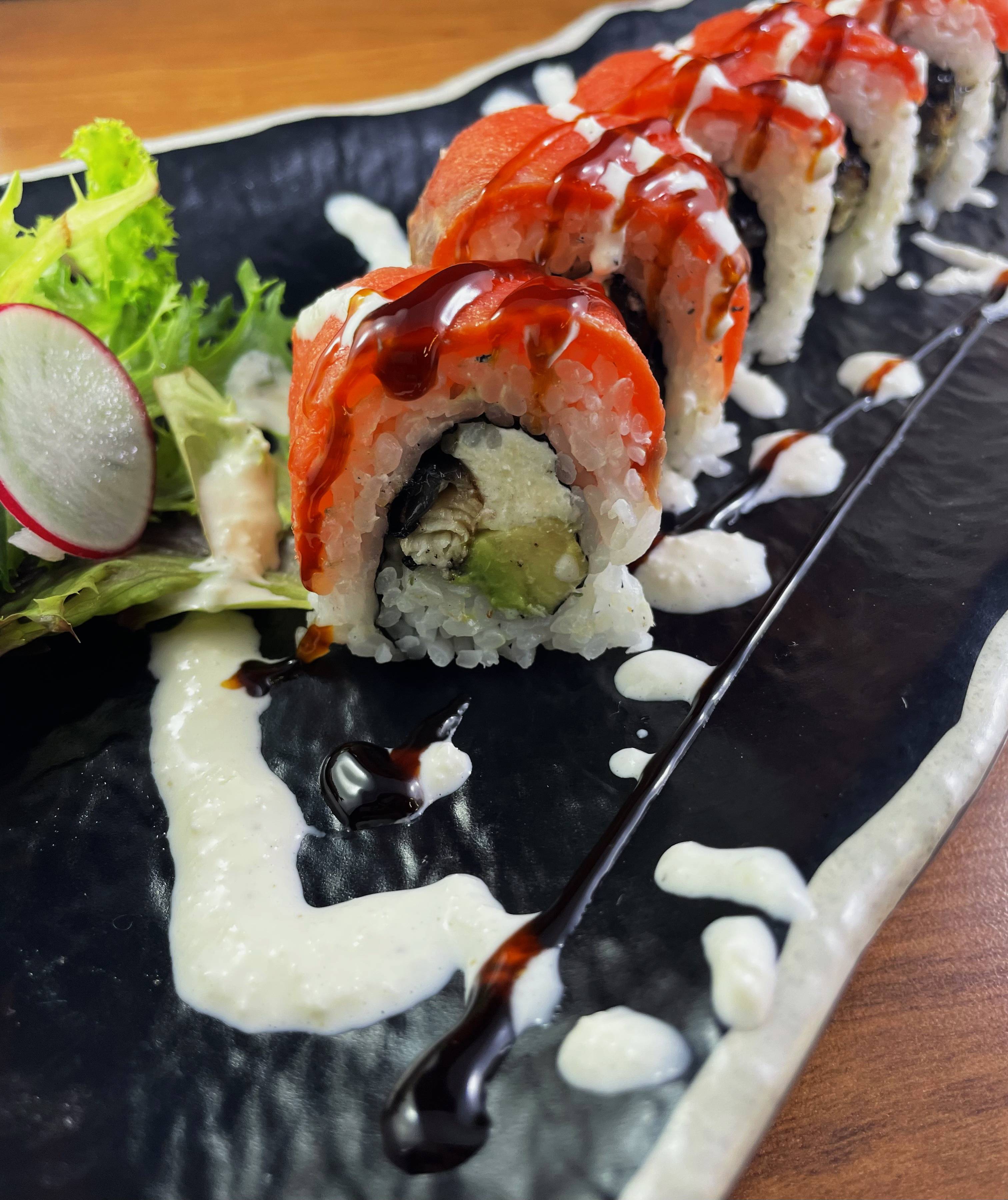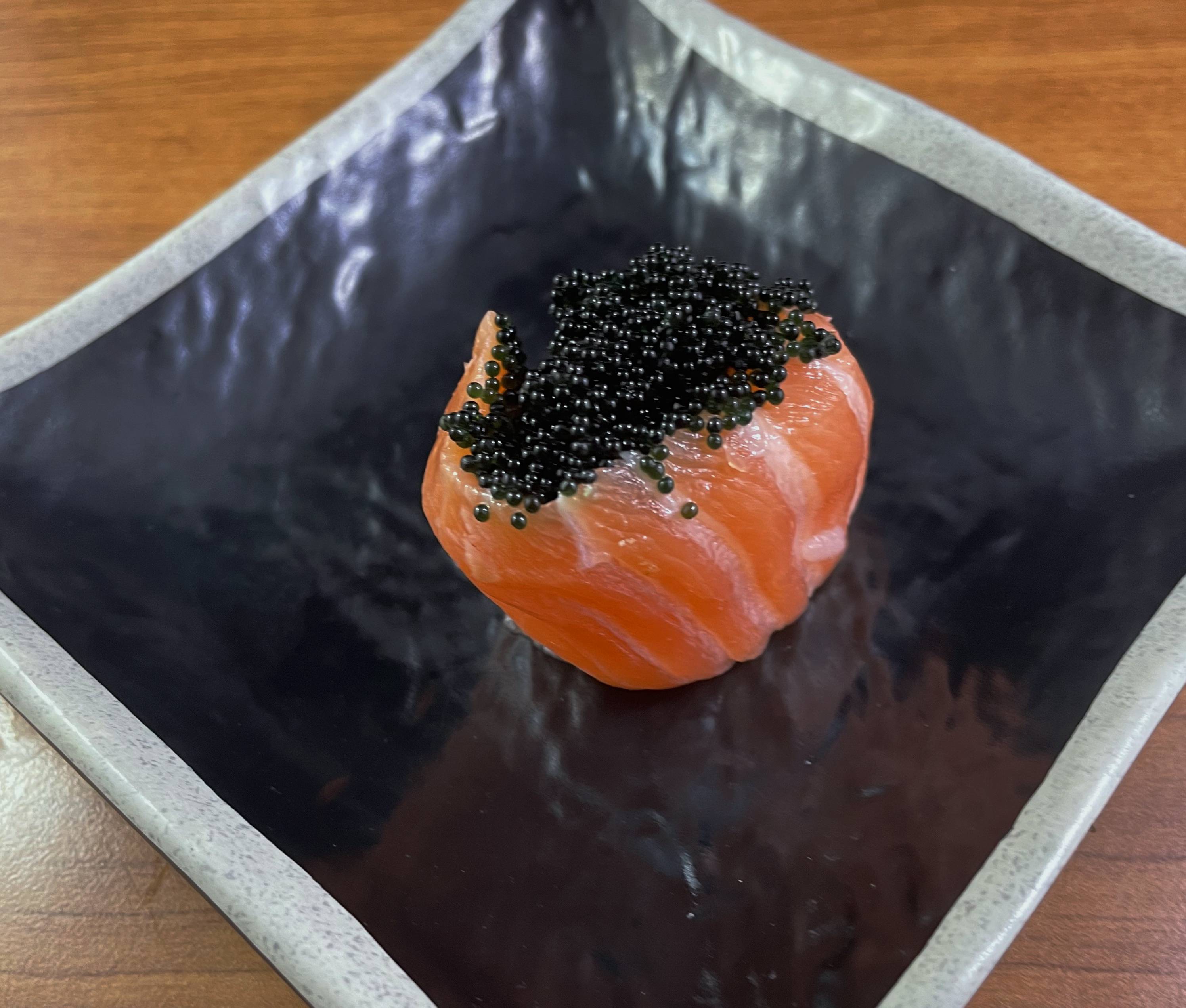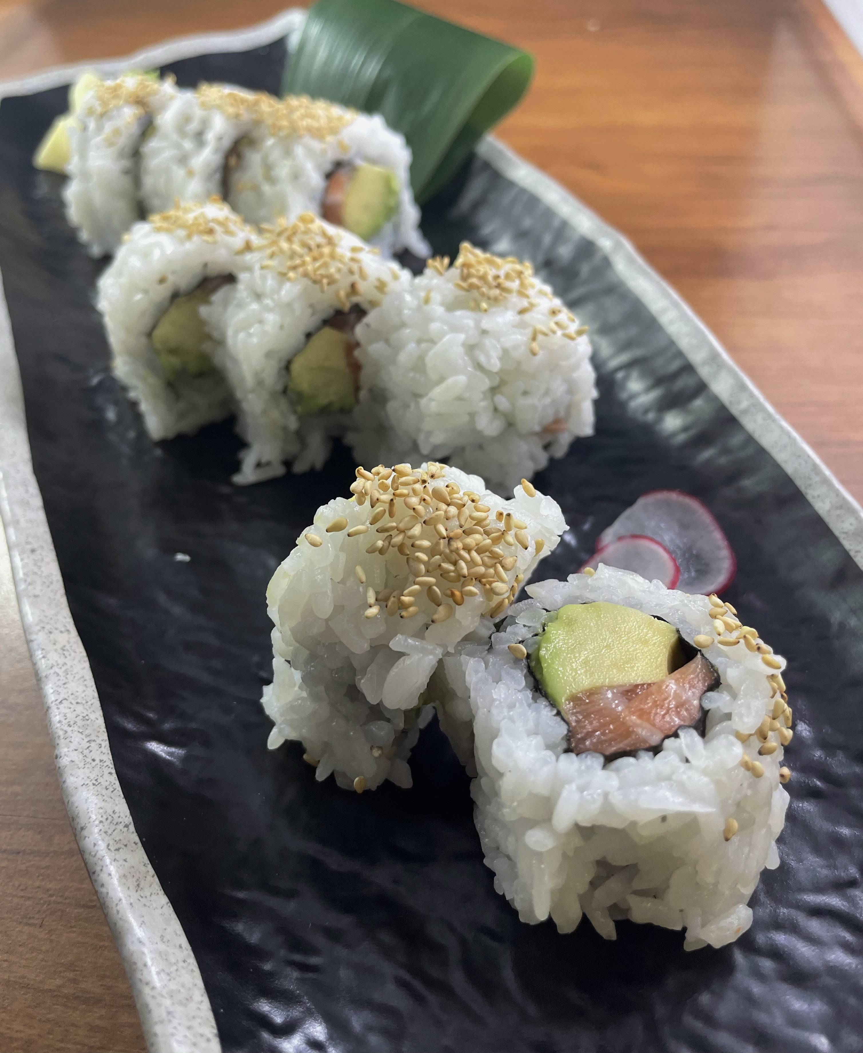 Avocado roll topped with salmon and house salad dressing covered with masago.