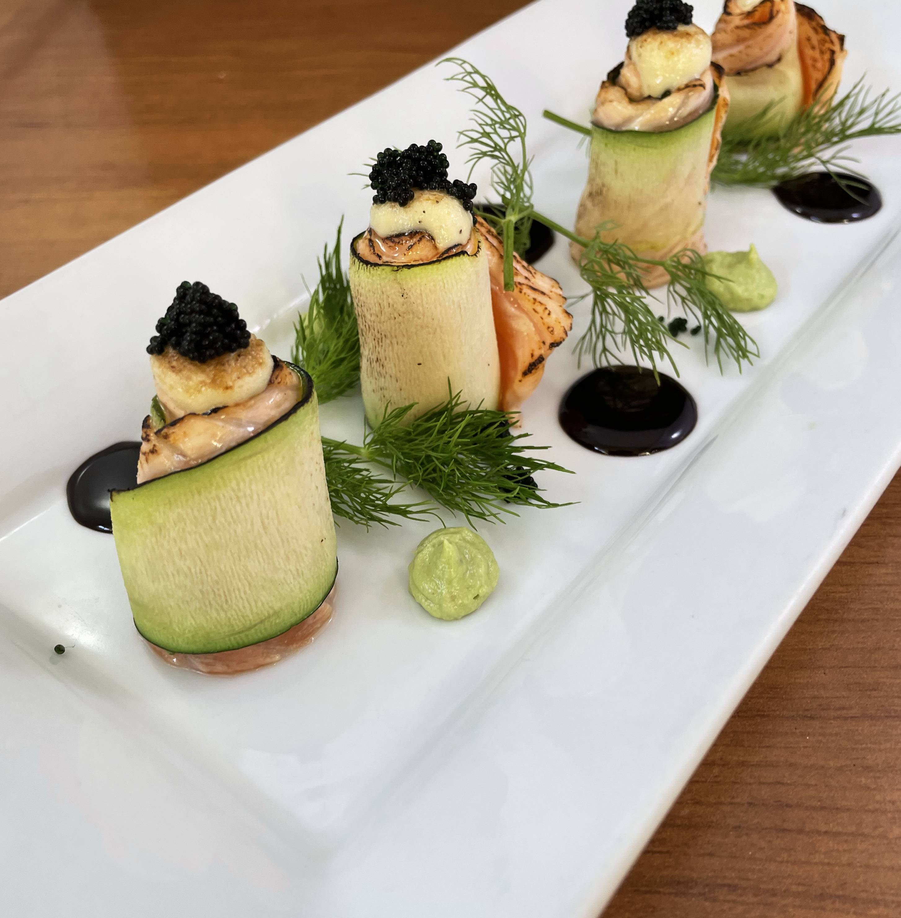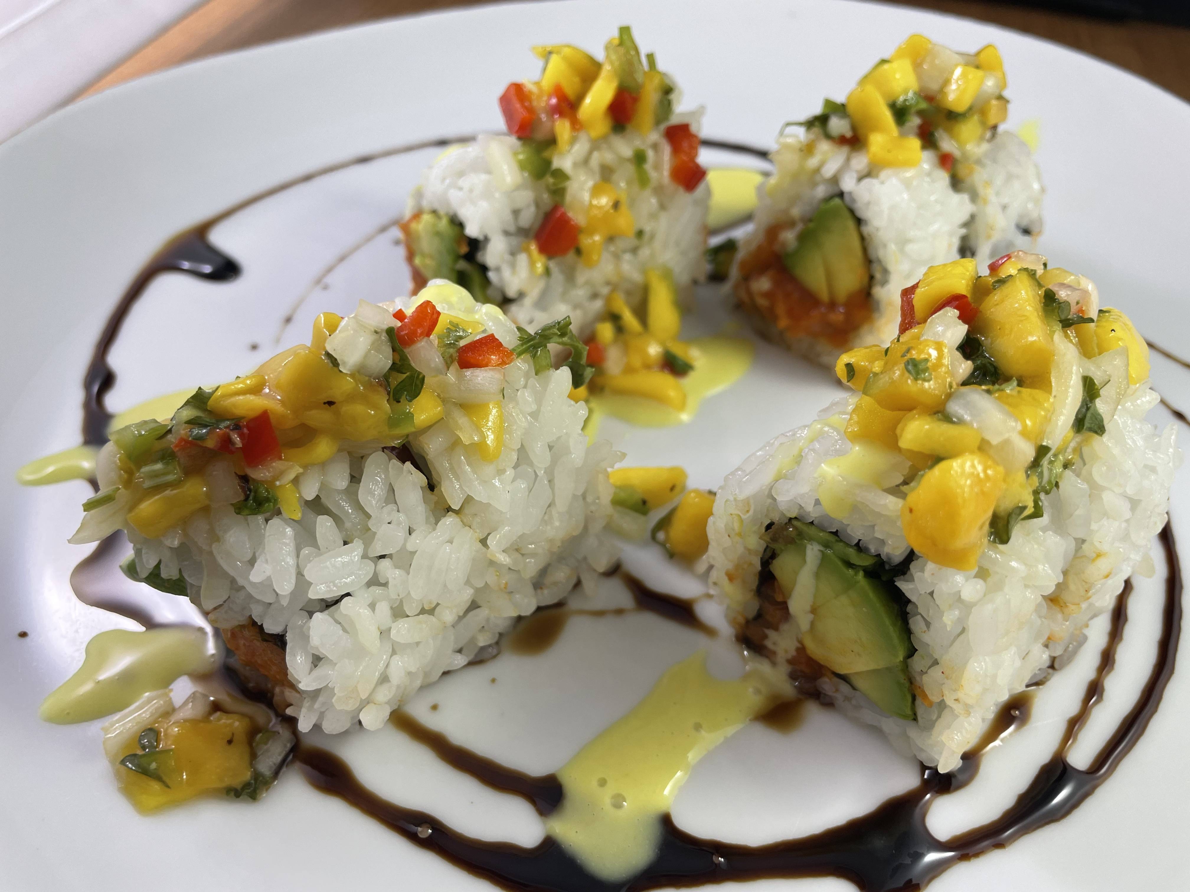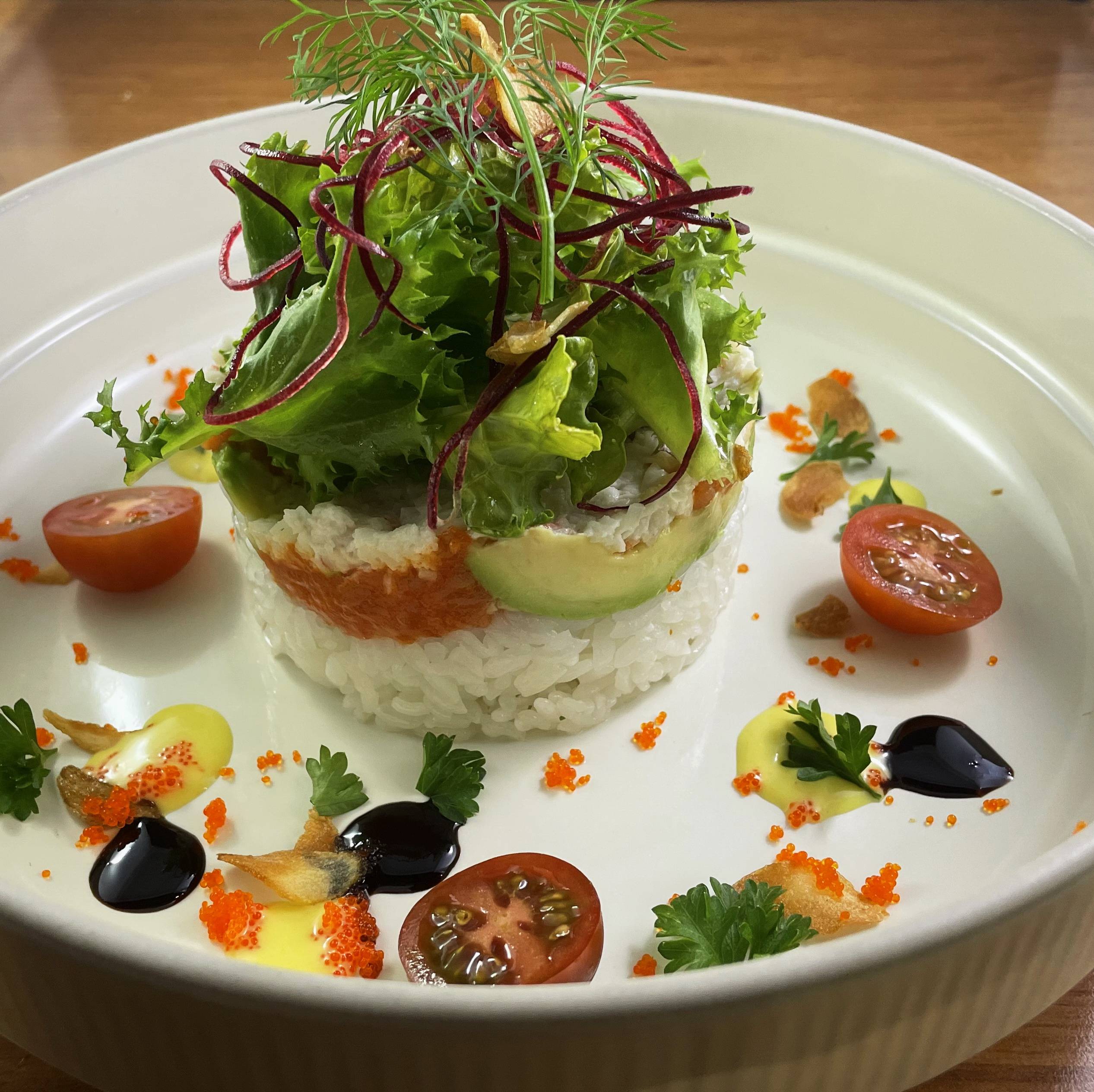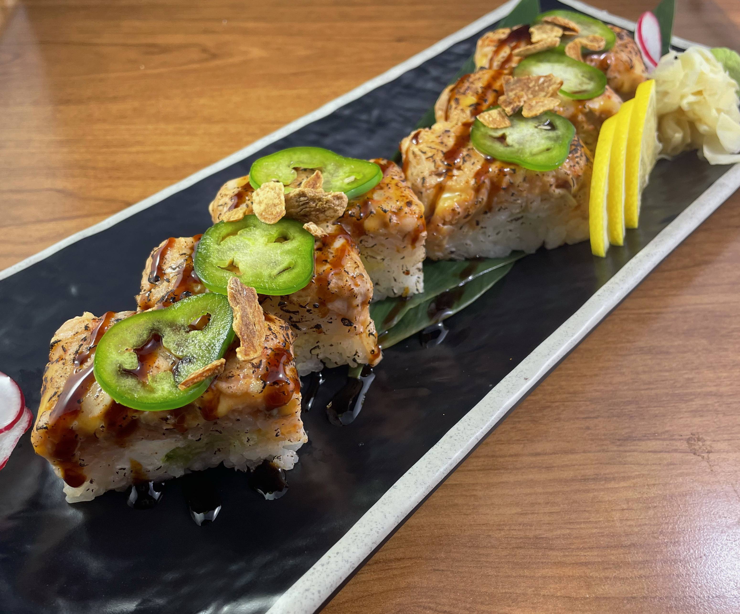 Avocado roll topped with salmon and house salad dressing covered with masago.