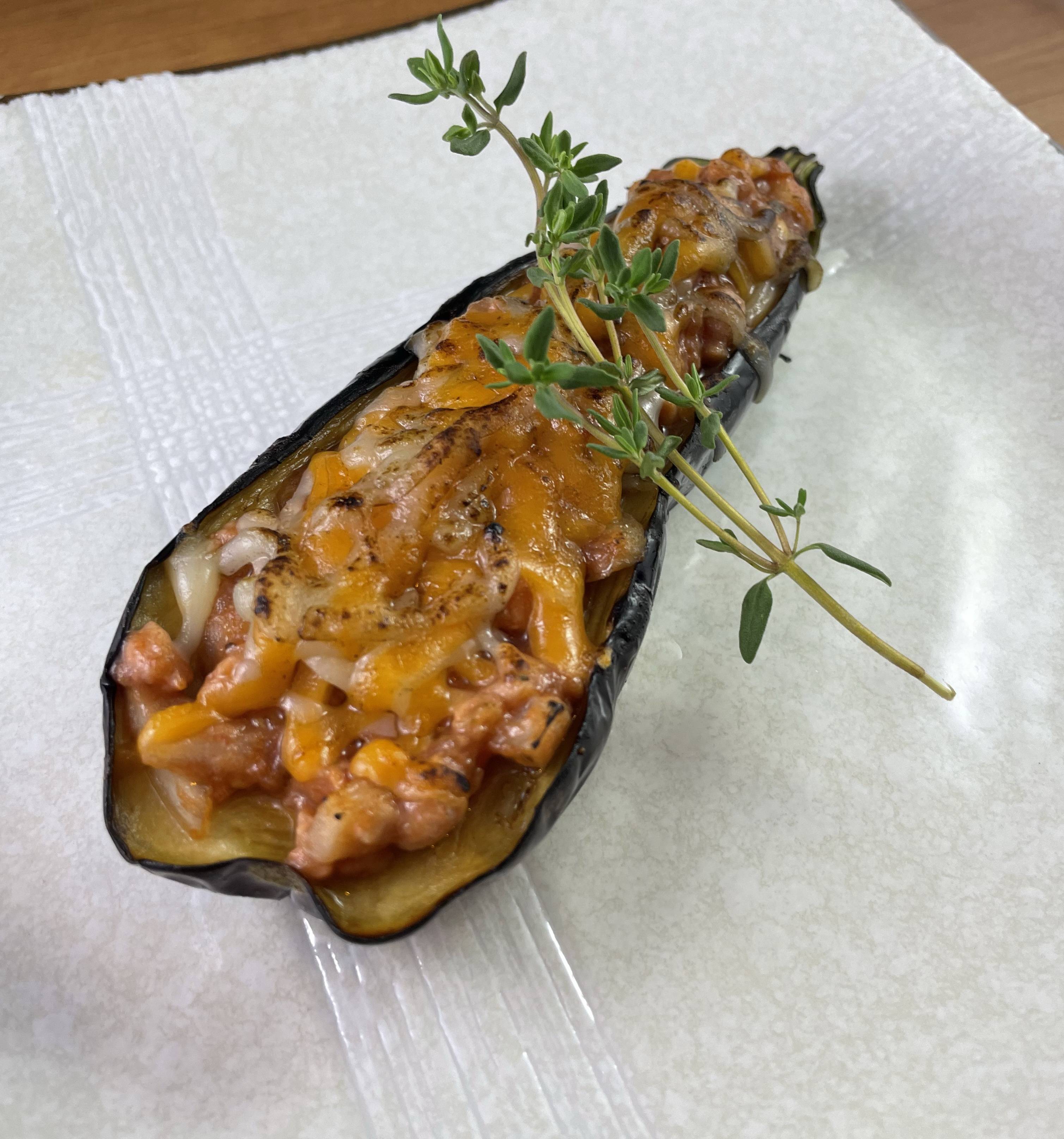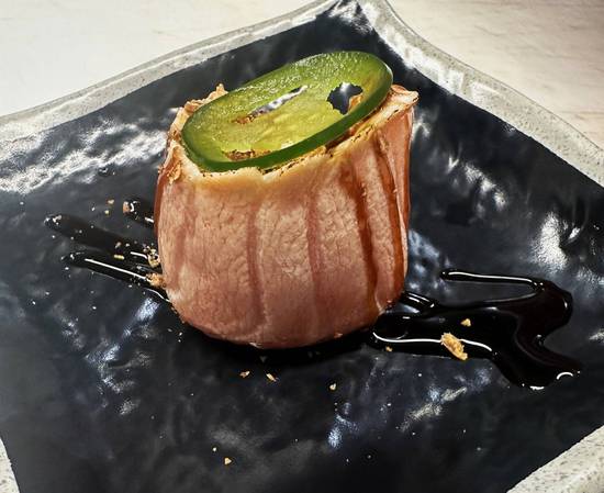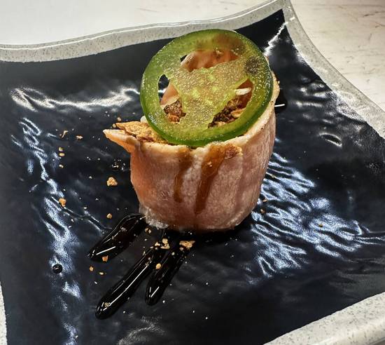 Aburi Salmon sushi in Gunkan style served with torched aburi sauce topped with unagi sauce, jalapeno slice, and garlic chips.