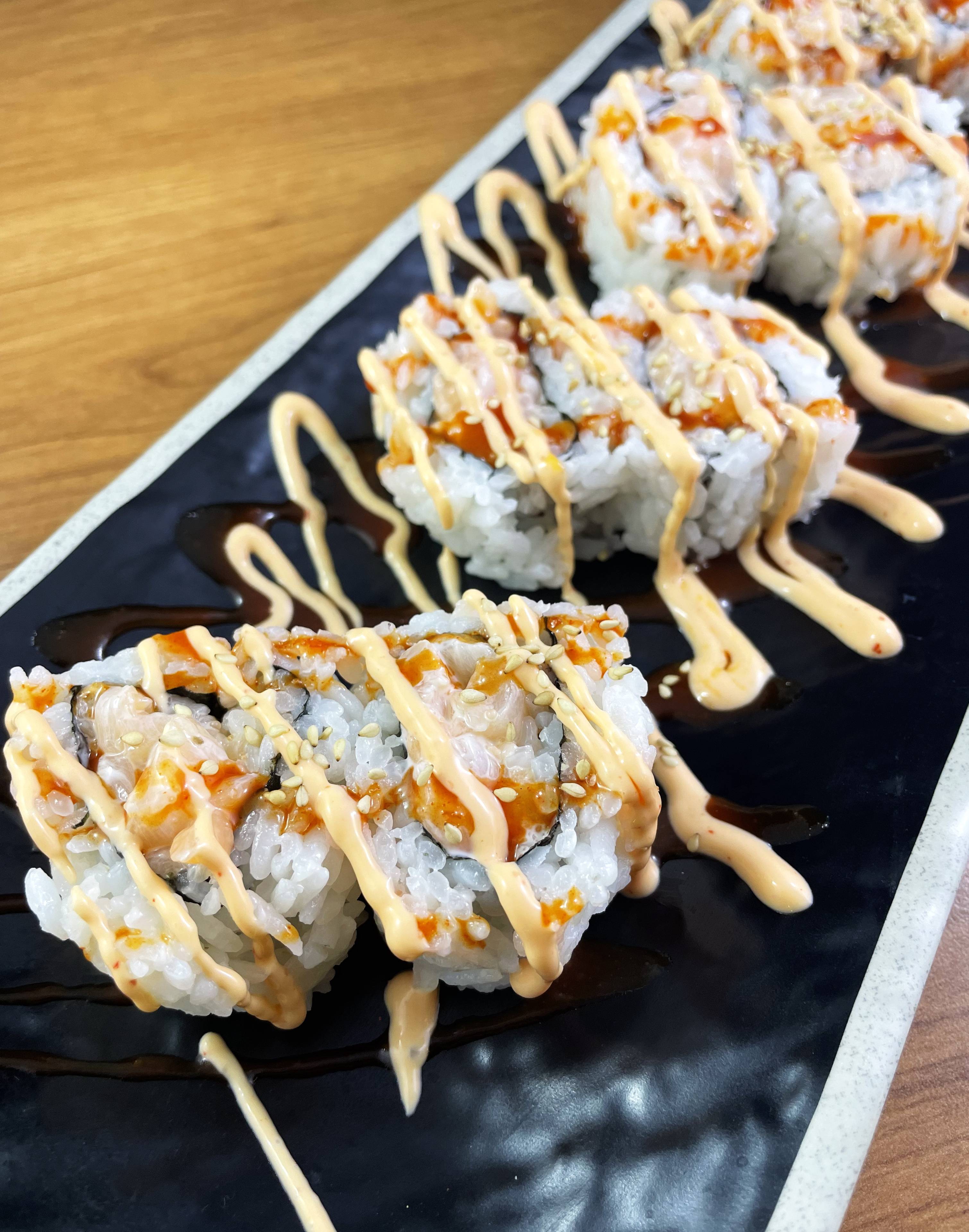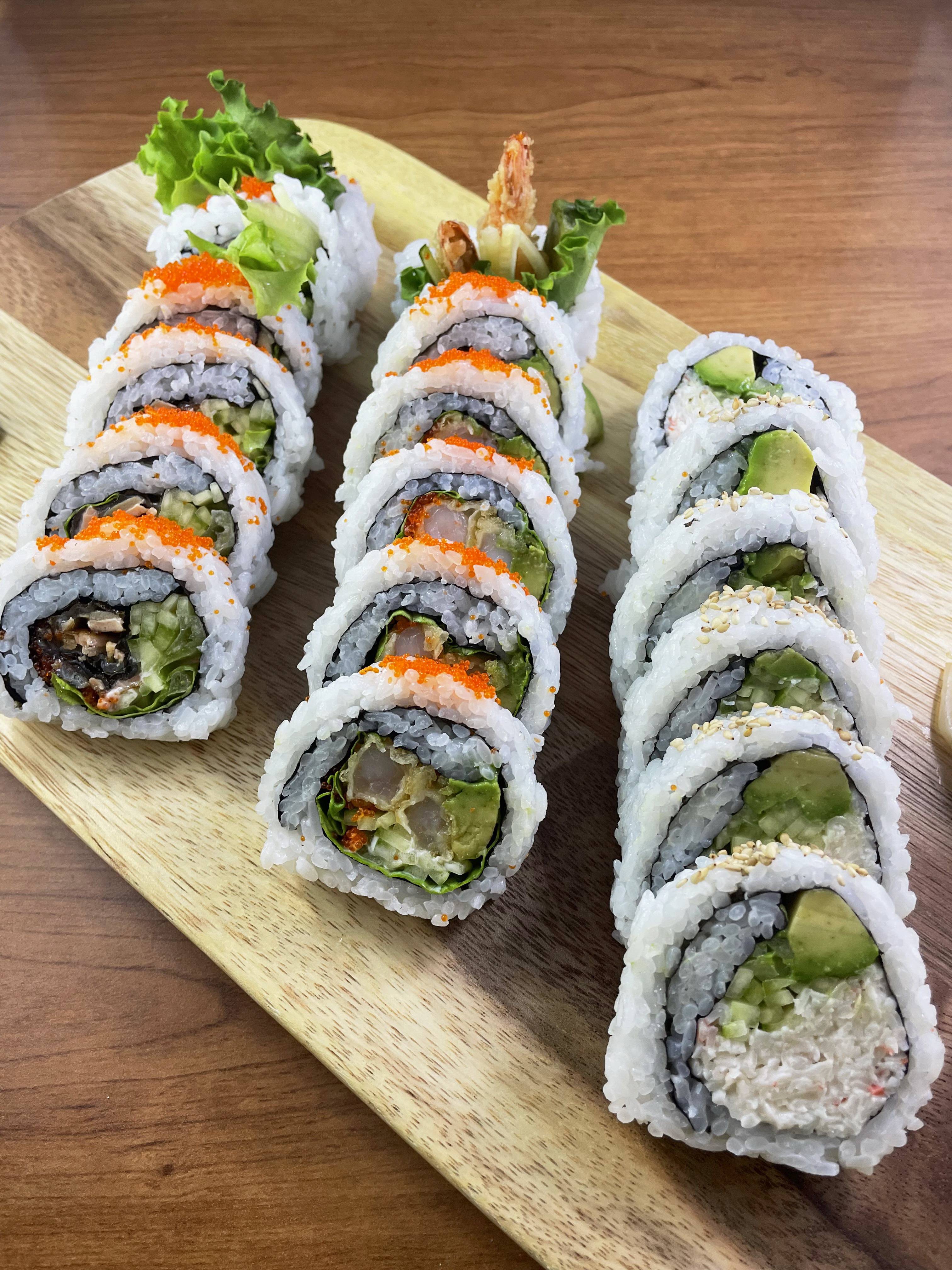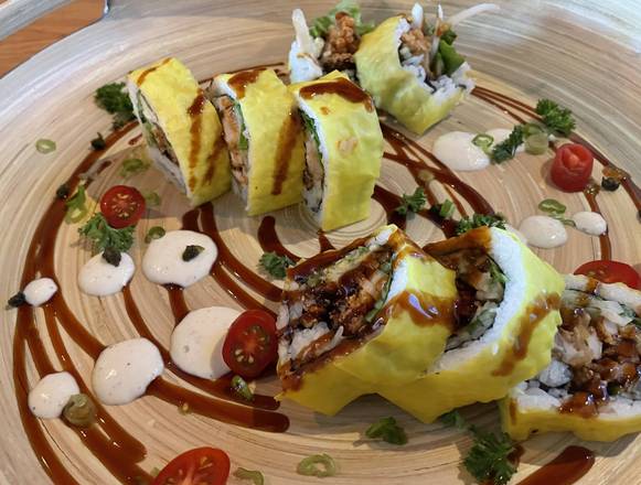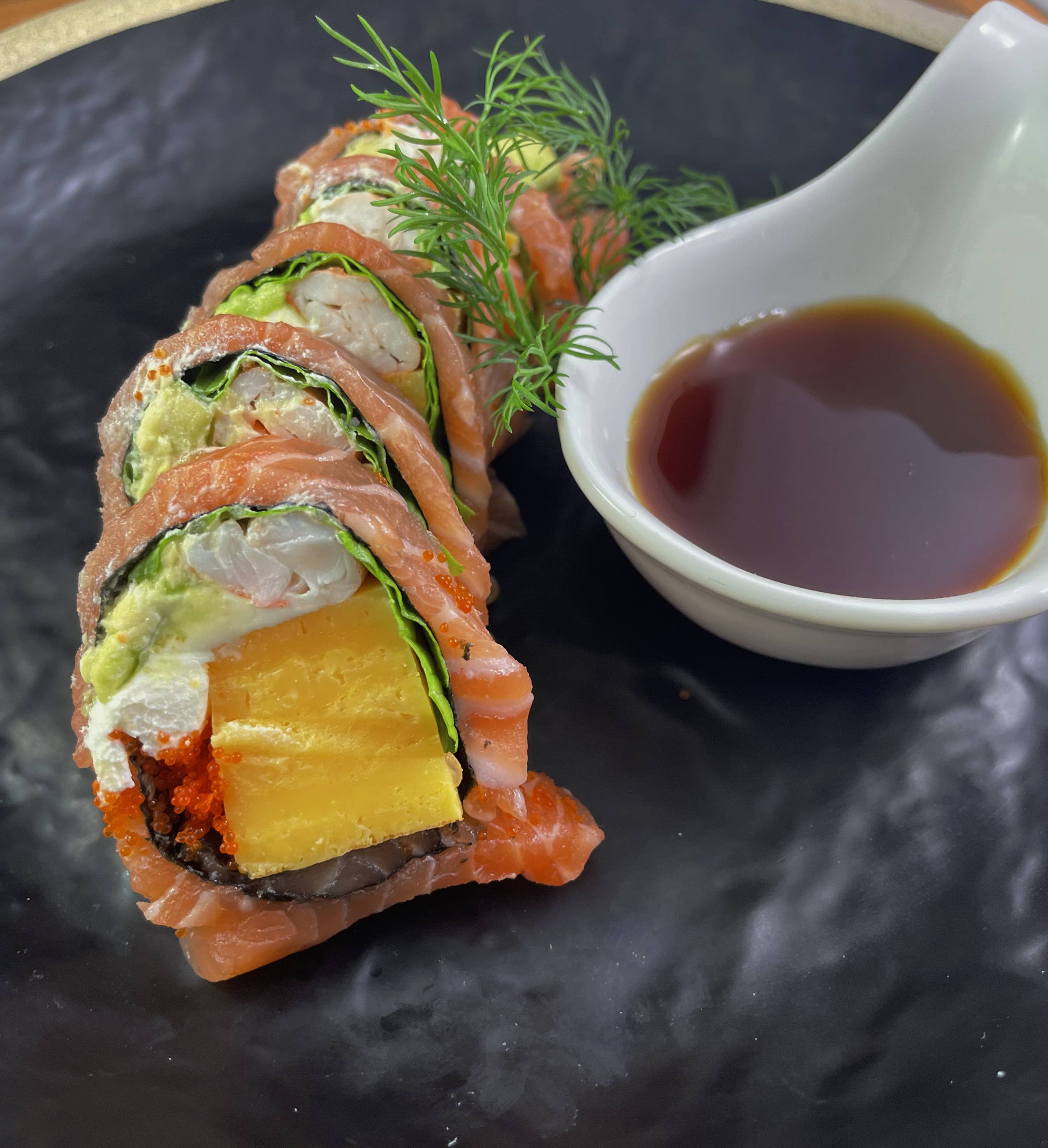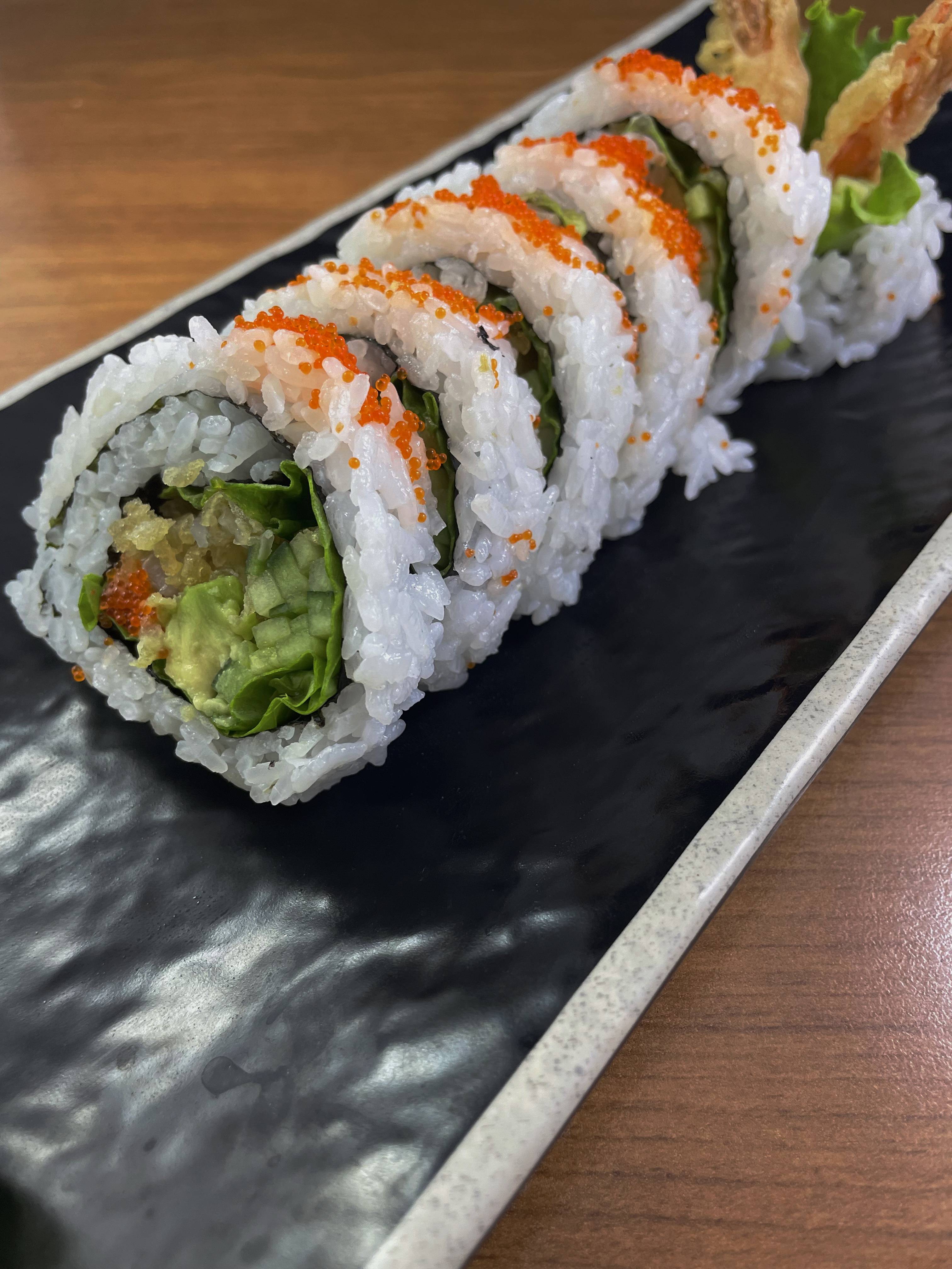 Classic “Everything” roll with crab meat, cucumber, lettuce, avocado, tamago, Salmon, and Hamachi sprinkled with masago on top