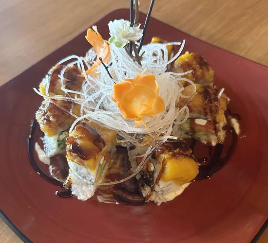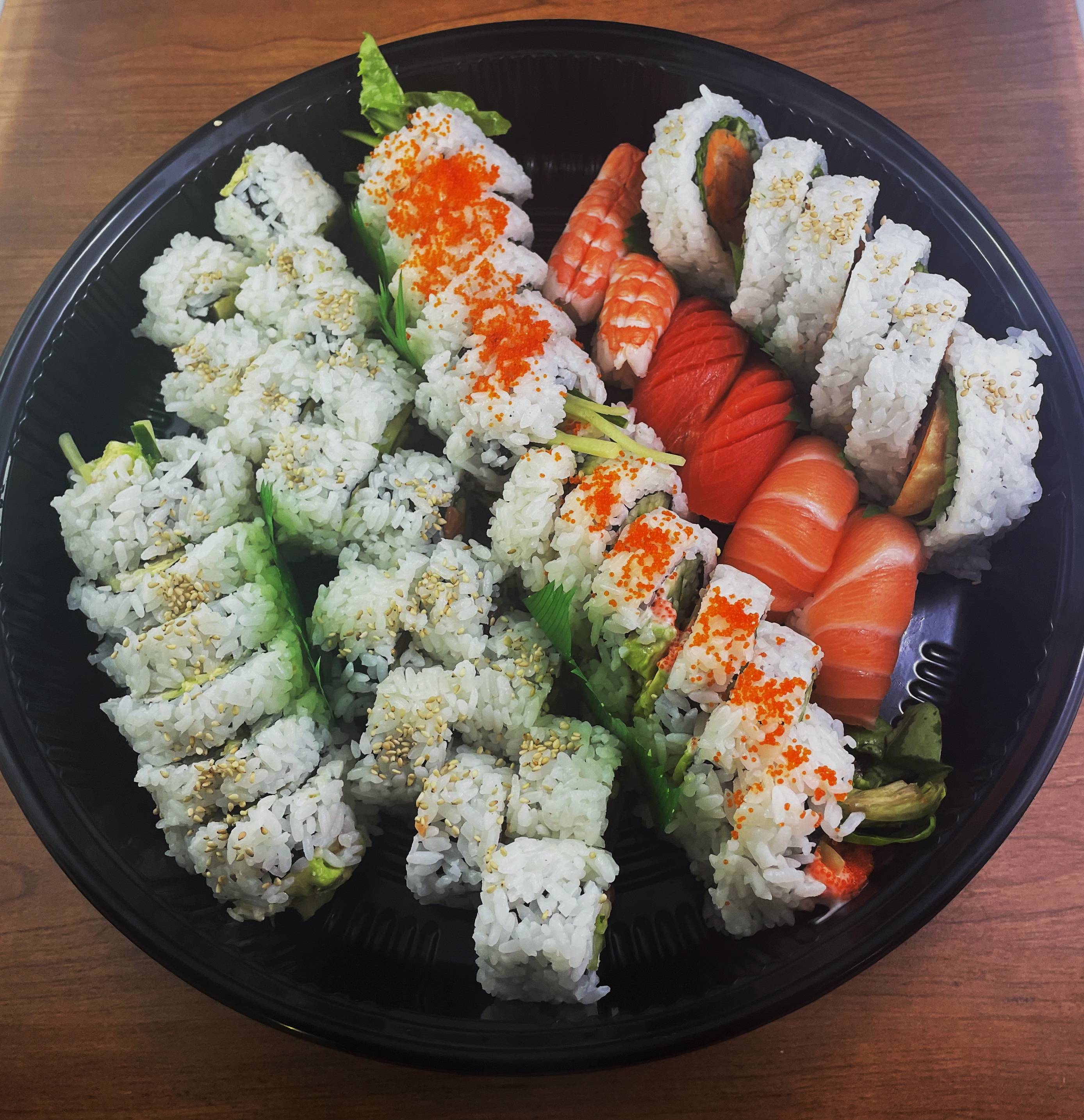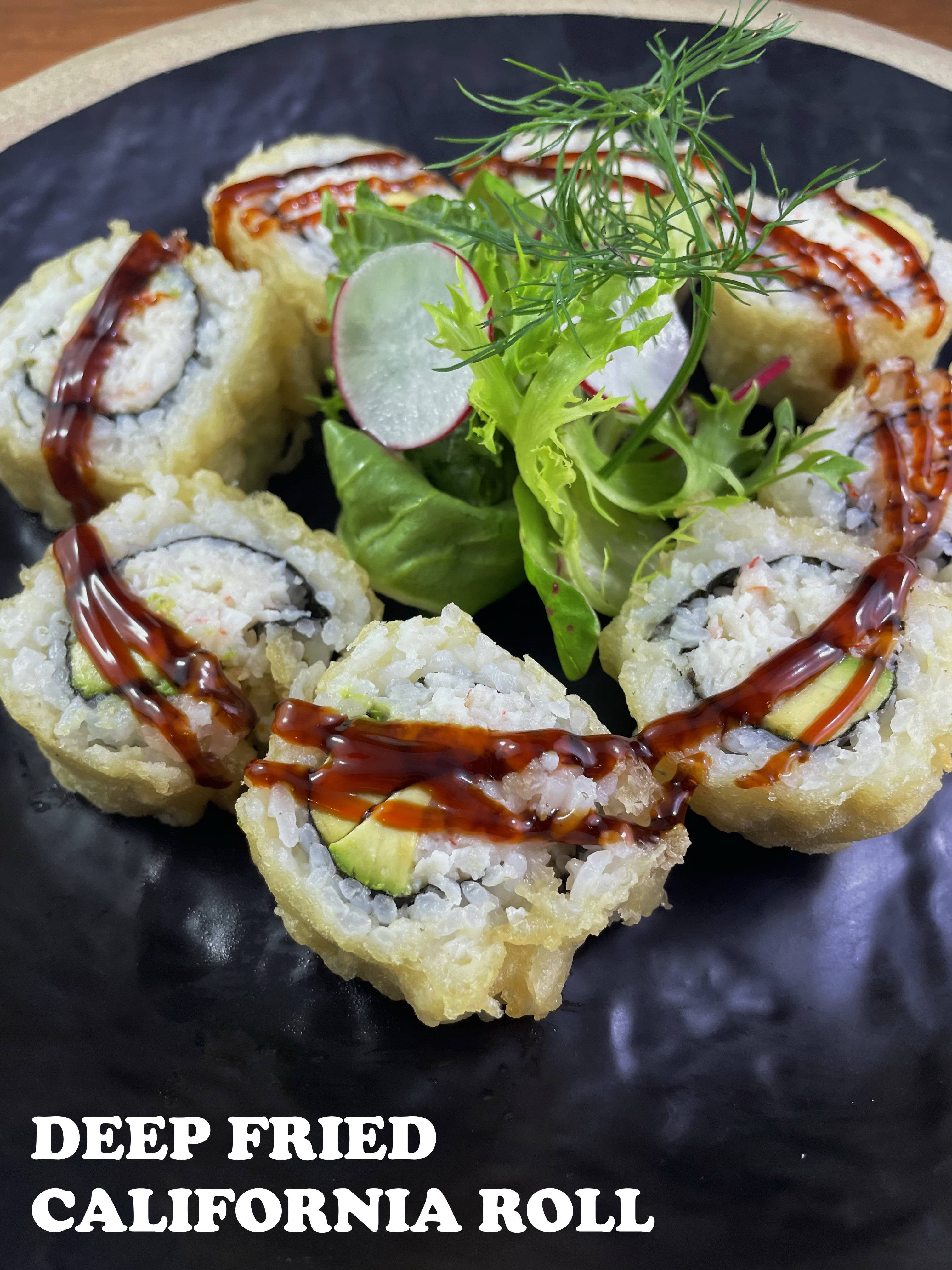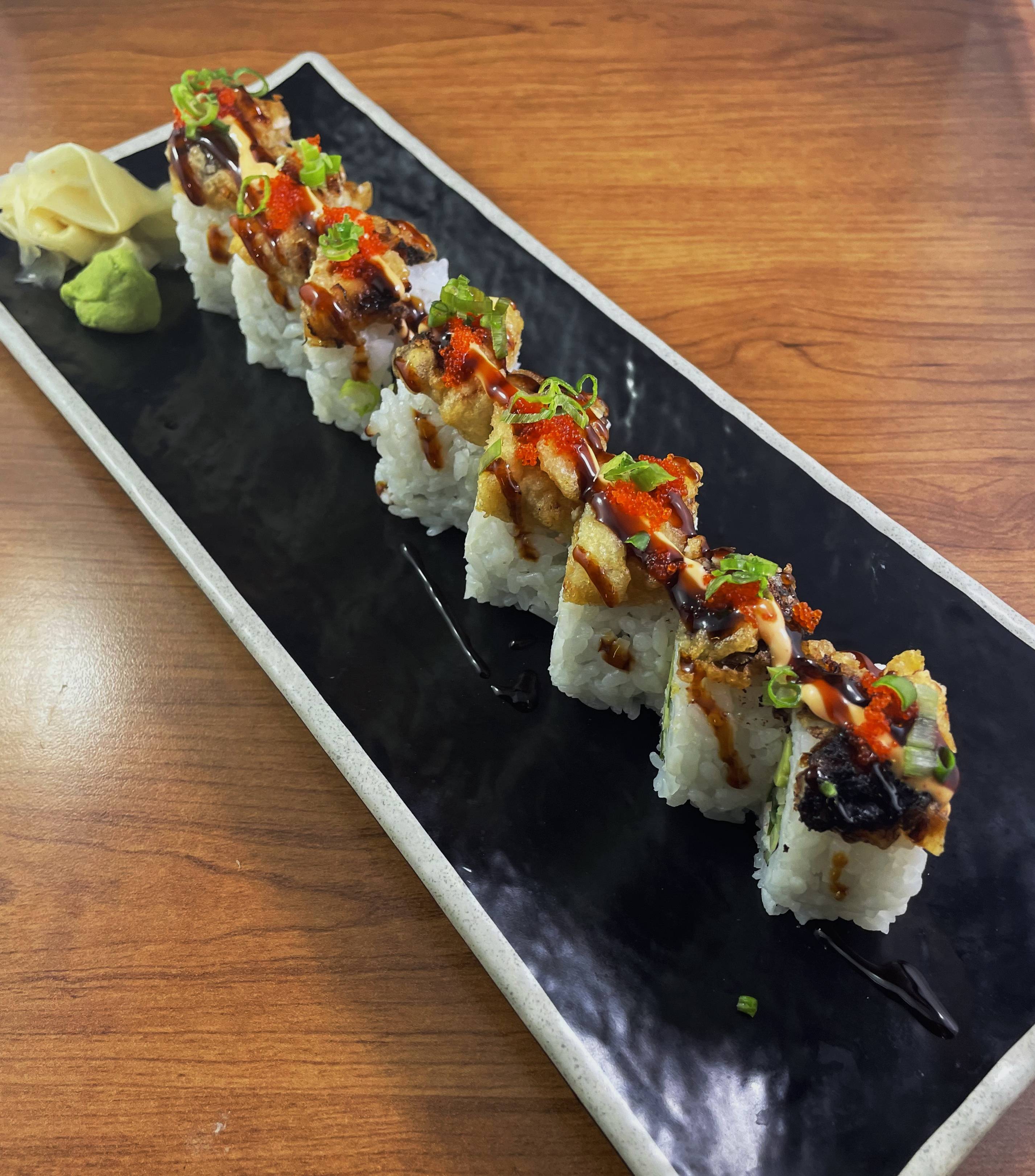 Classic “Everything” roll with crab meat, cucumber, lettuce, avocado, tamago, Salmon, and Hamachi sprinkled with masago on top