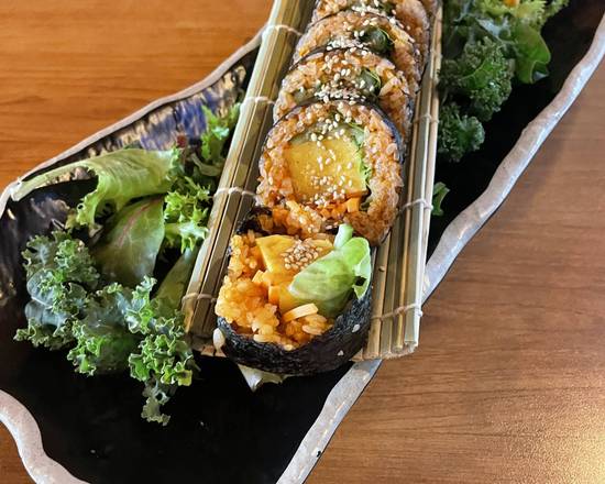 Deep-fried yam, lettuce, cucumber, and avocado with mayo and sprinkled with sesame seed.