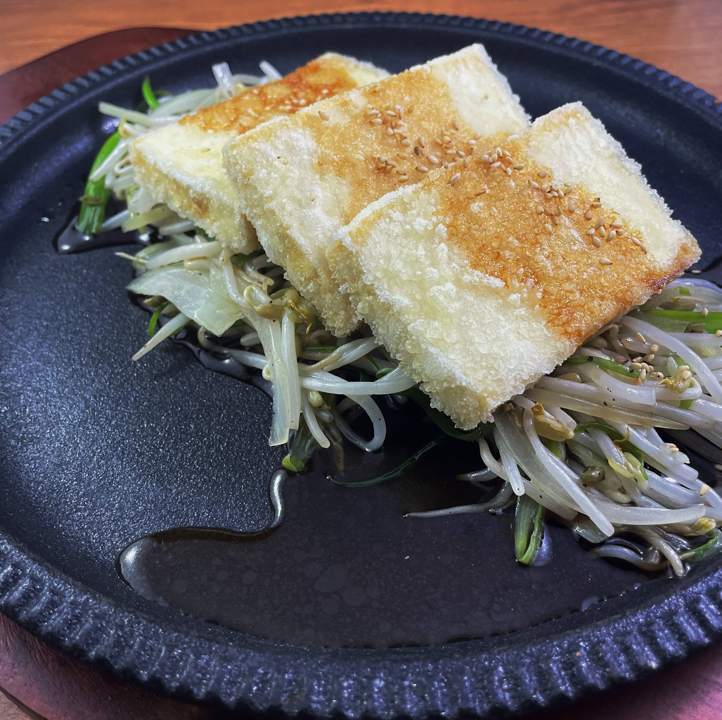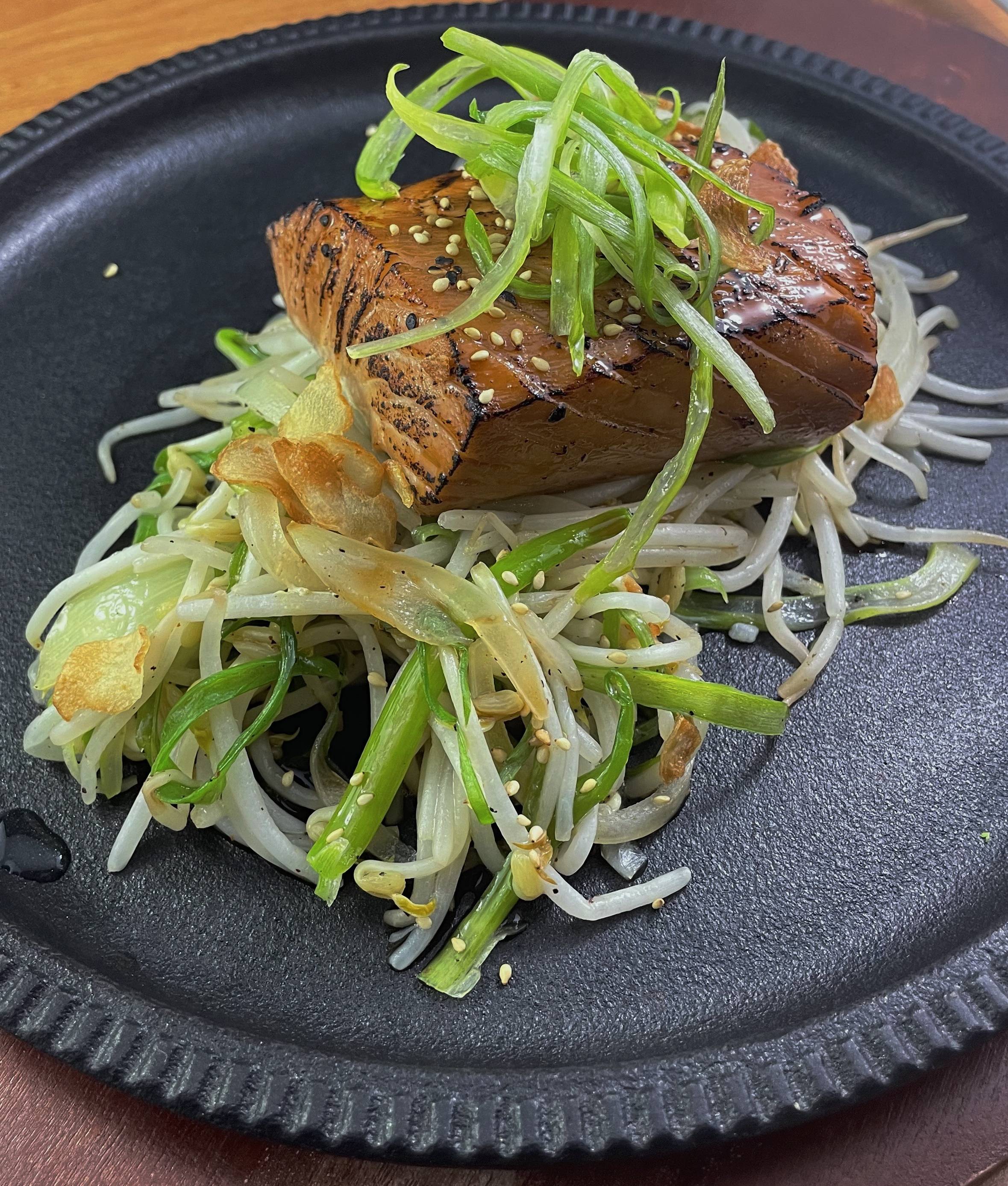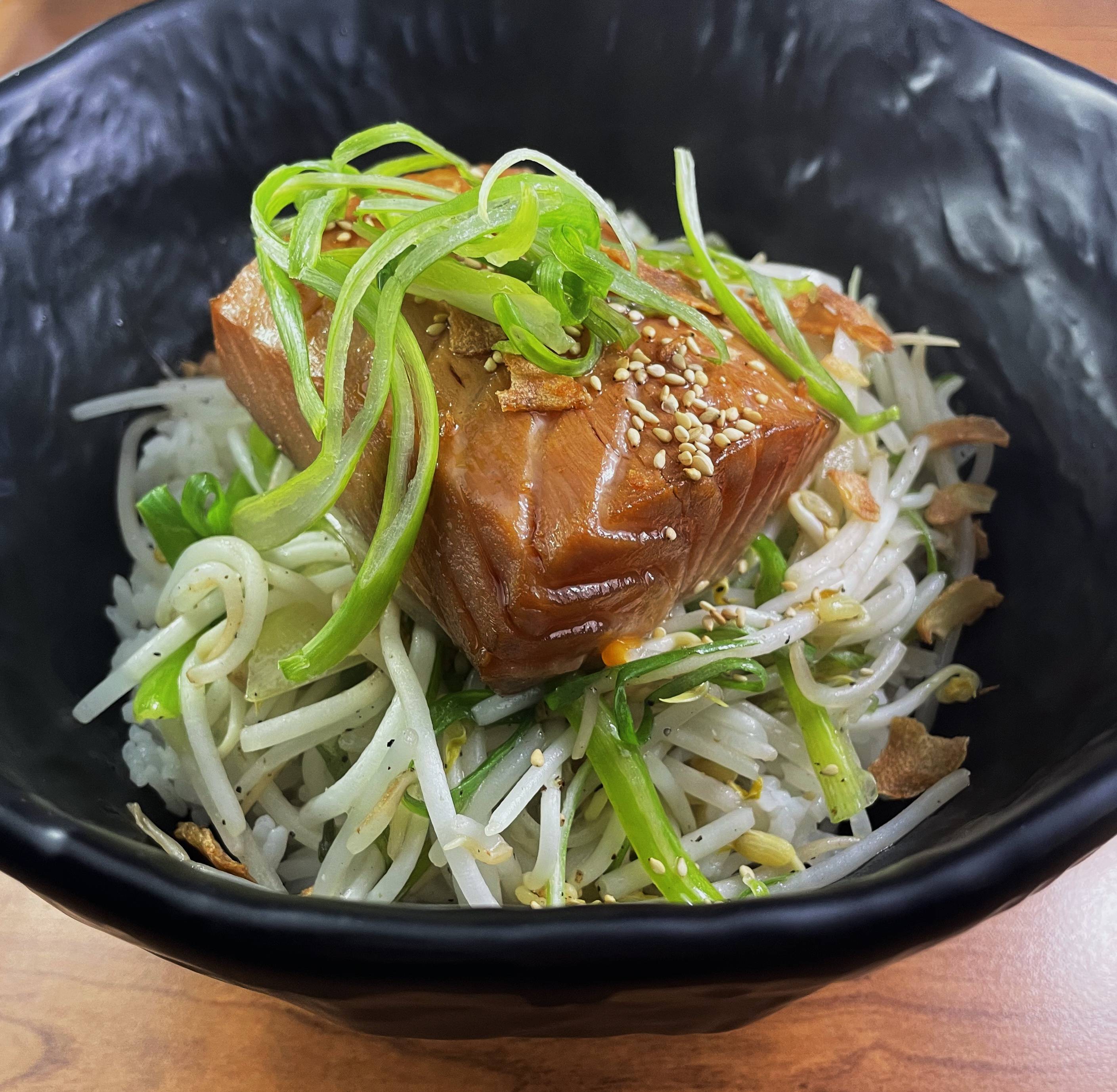 Pan-fried salmon and veggies in teriyaki sauce on rice sprinkled with sesame seeds and garlic chips on top. Served with miso soup on the side.