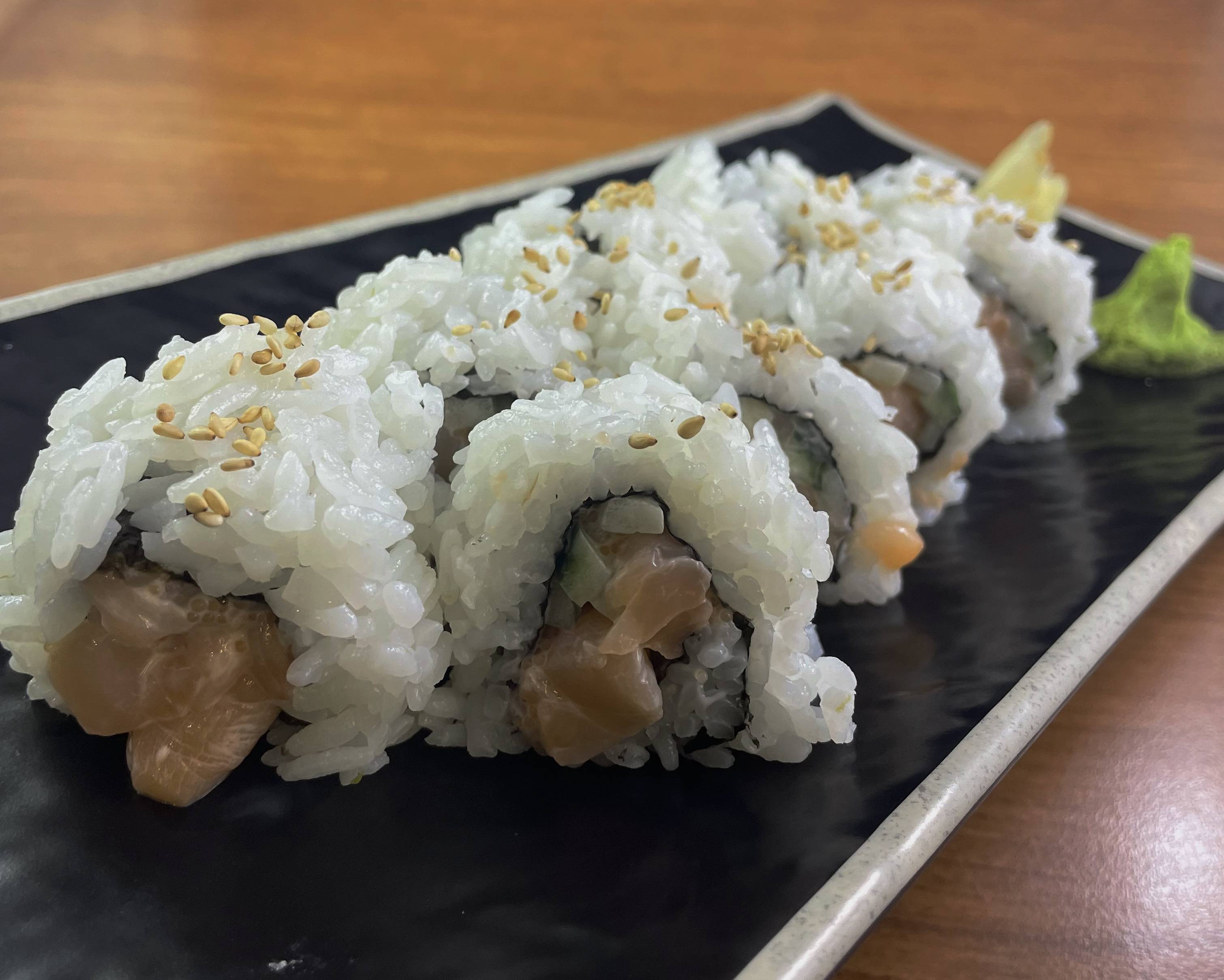 Roll with spicy sockeye salmon and cucumber. Sprinkled with sesame seed on top.