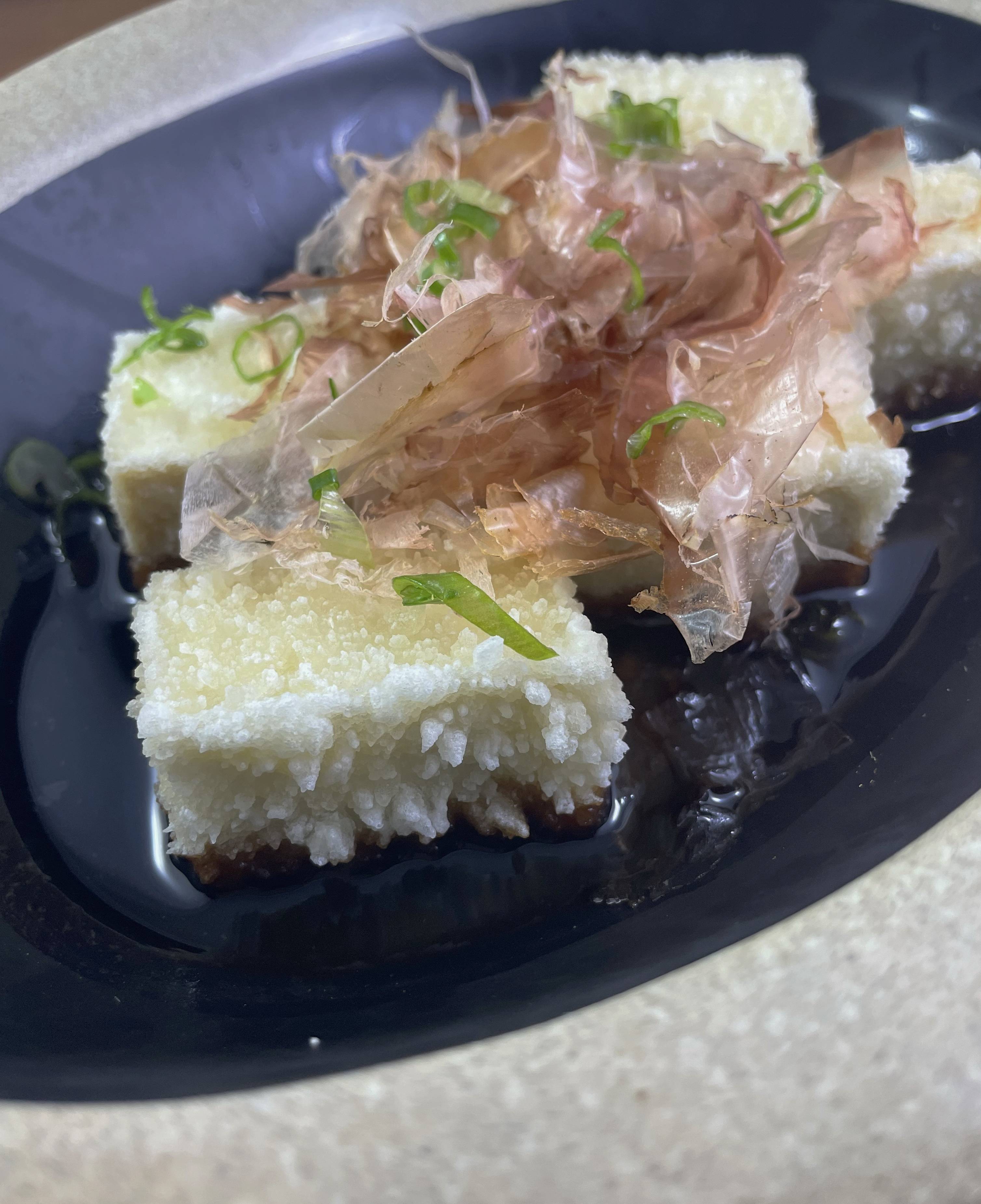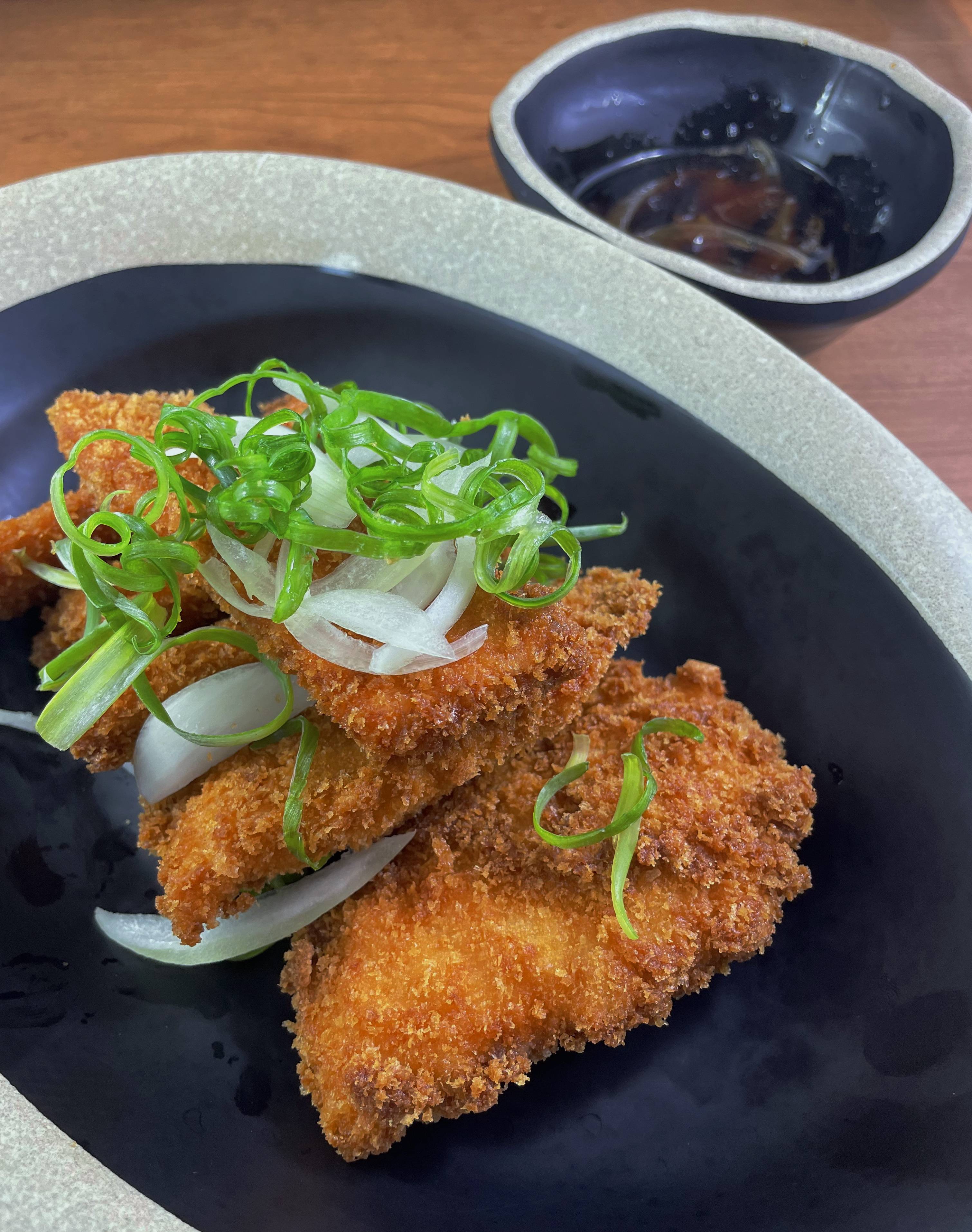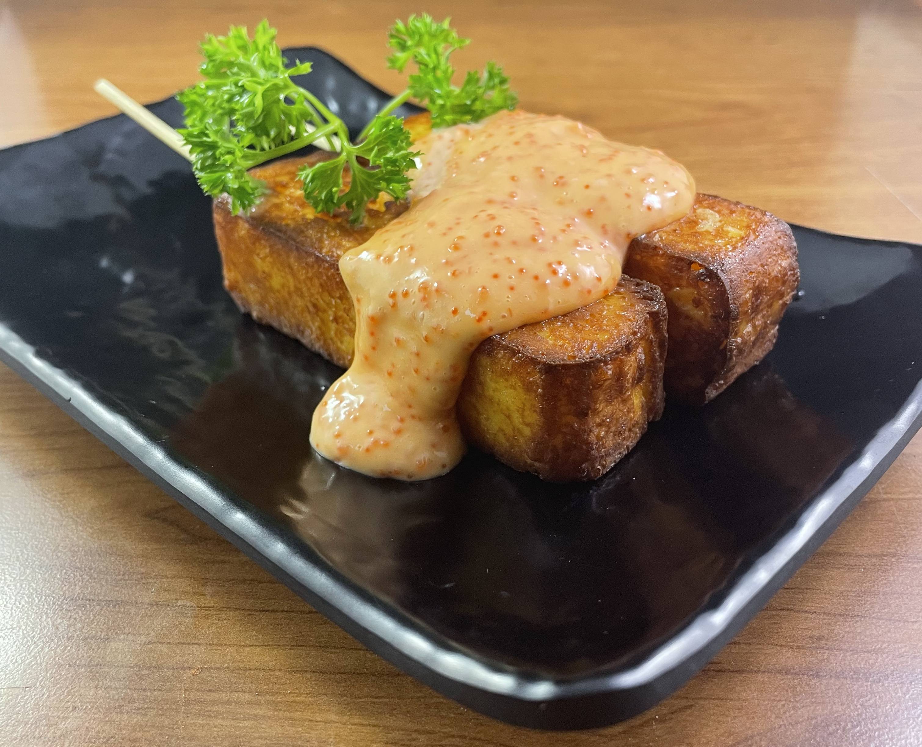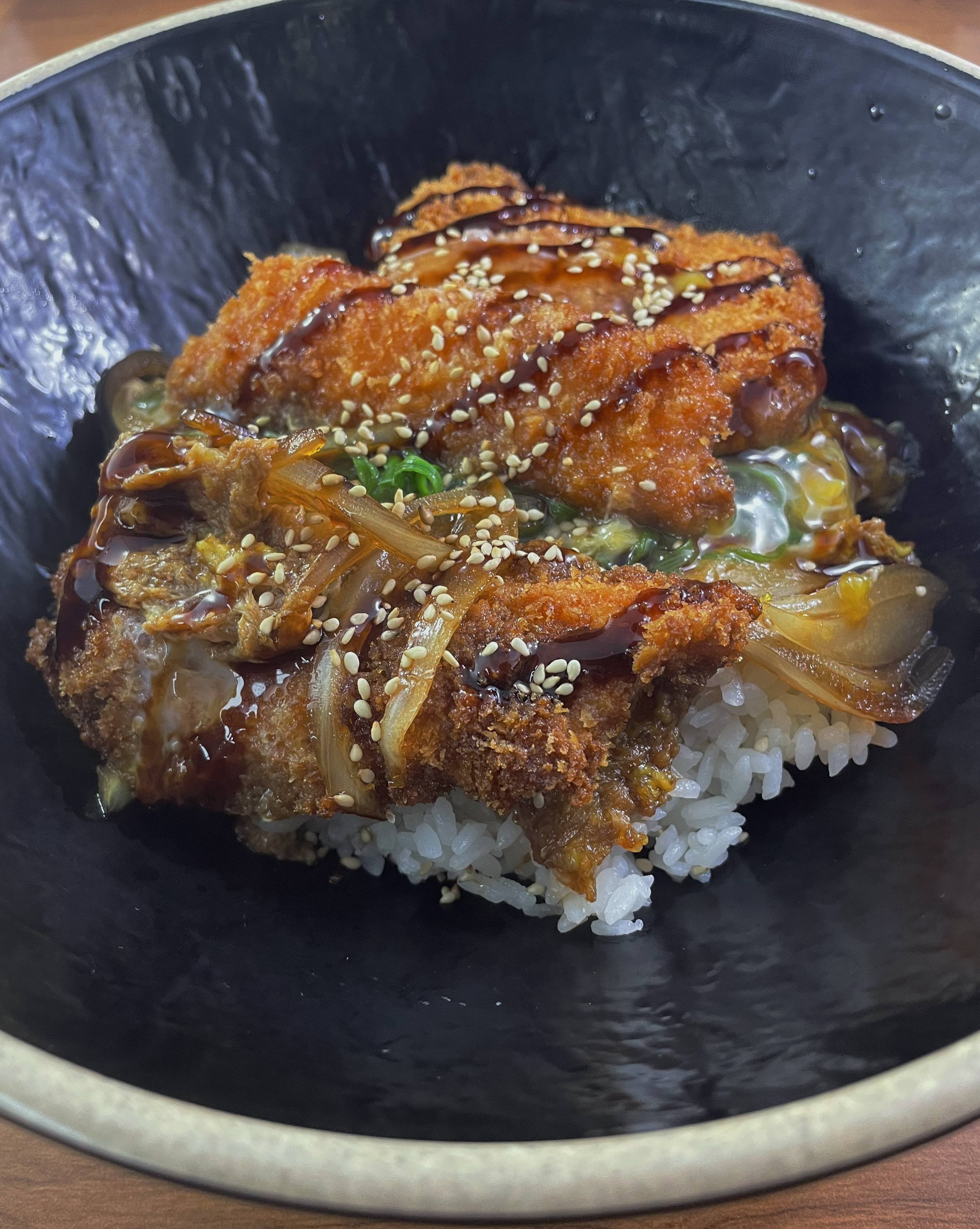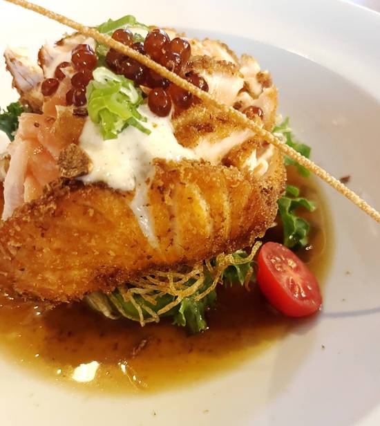 Crispy panko-breaded deep fried salmon nuggets (3pcs) with onion, green onion, and half cooked egg on rice served with Tempura and Unagi sauce topped with fish flakes