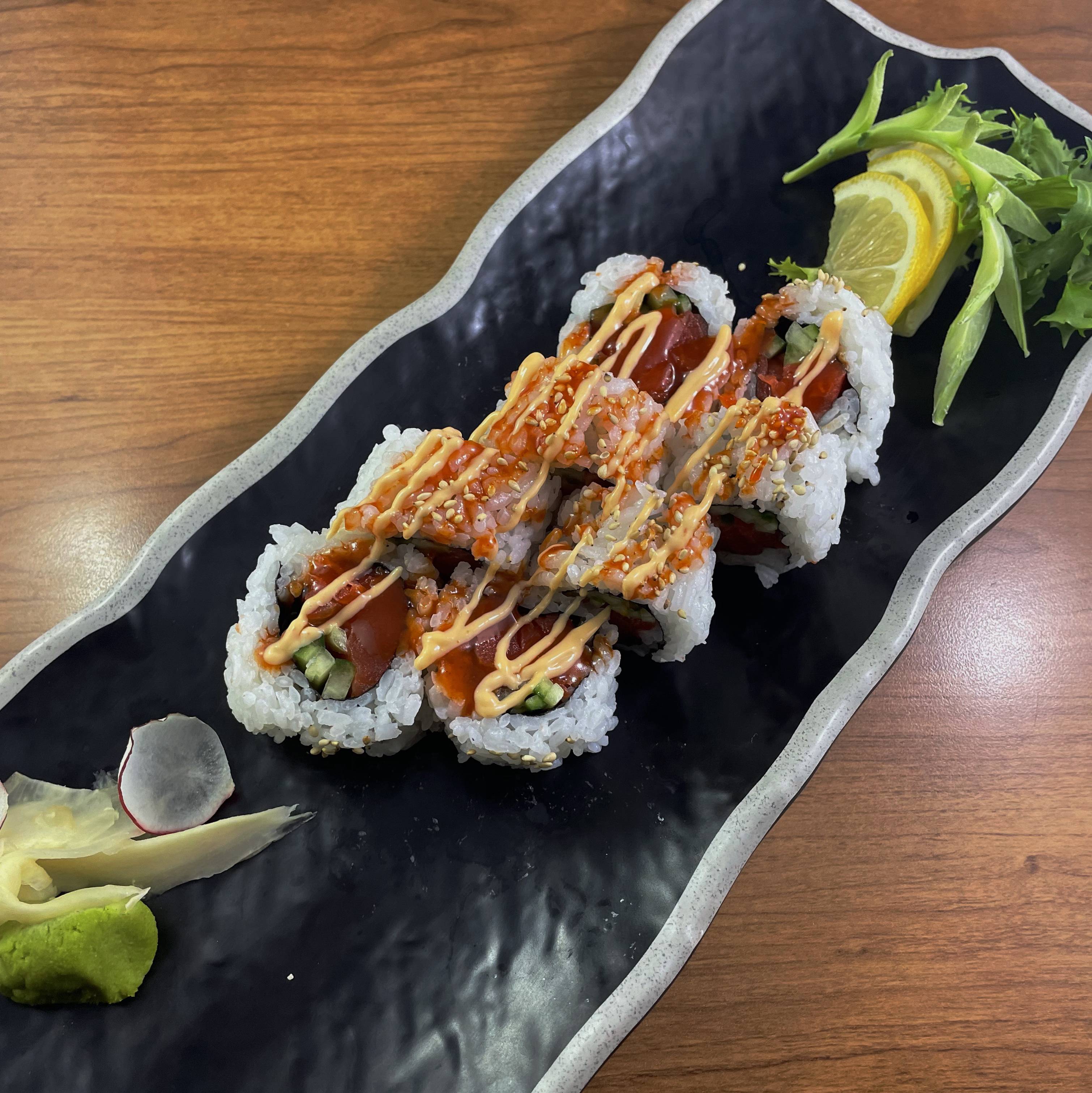 Roll with spicy salmon and cucumber. Spicy mayo sauce on top and sprinkled with sesame seeds.