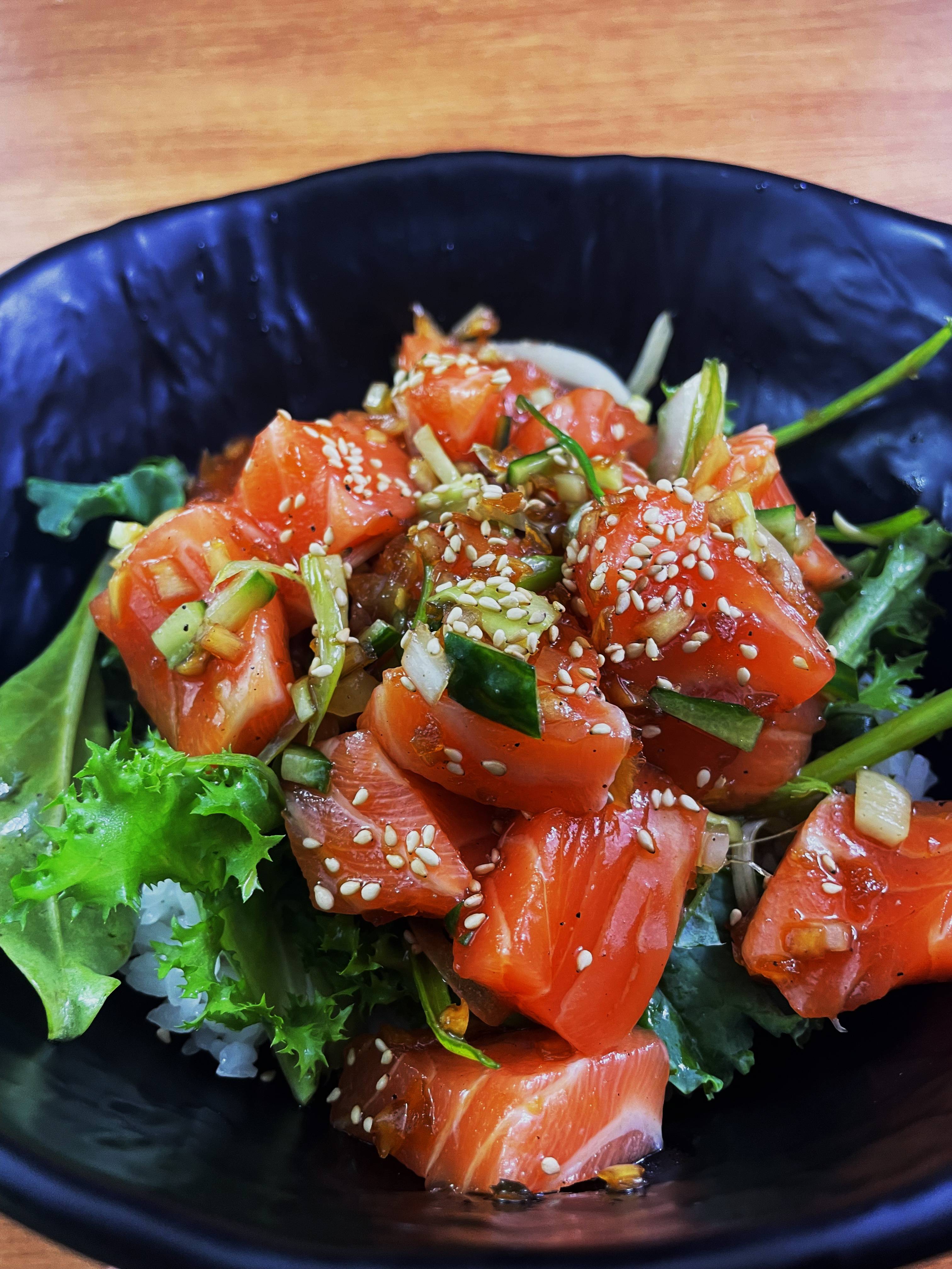 Salmon sashimi in house special spicy sauce with green onion, onion, carrot, cucumber on rice topped with garlic flake and sesame seed