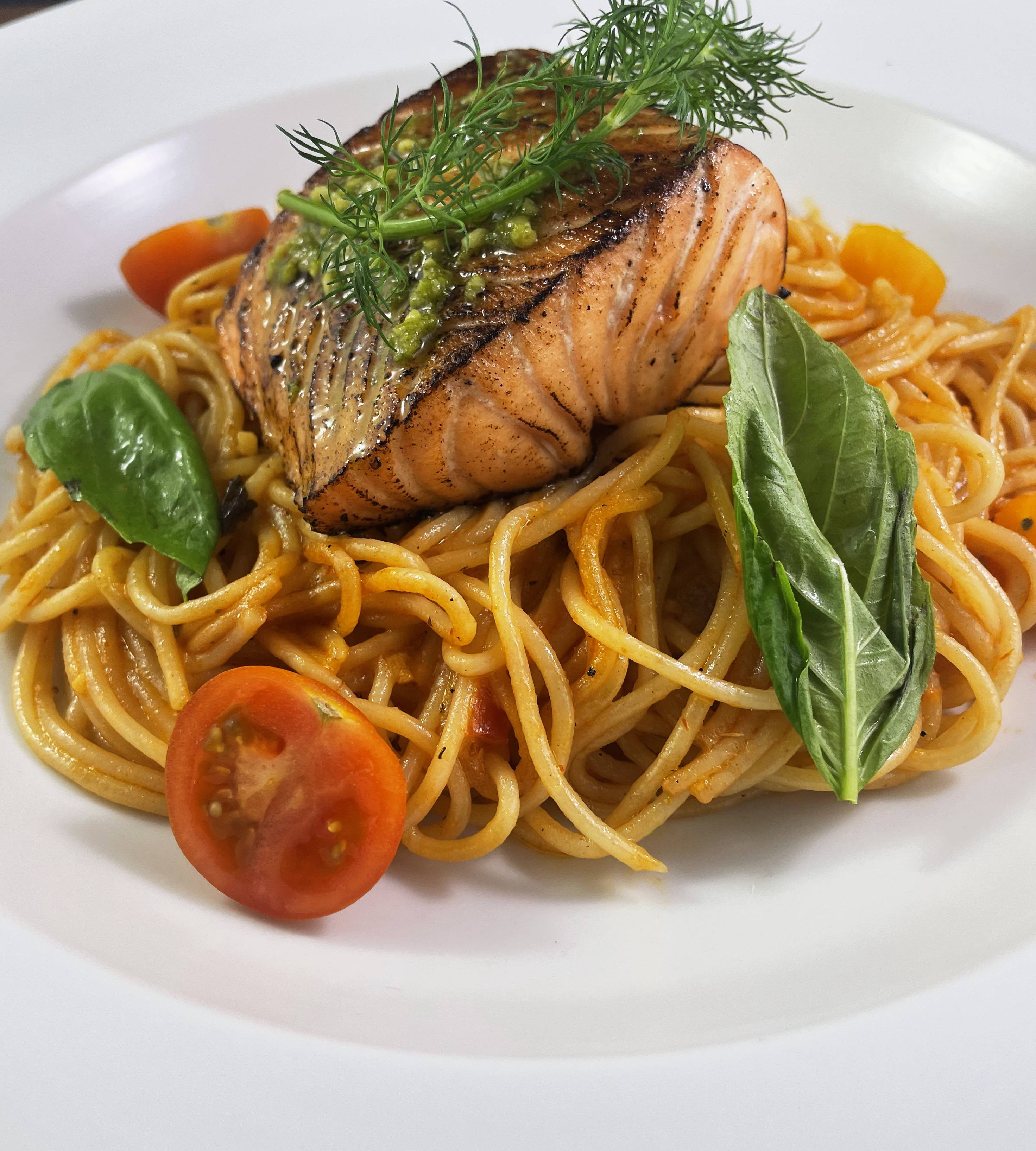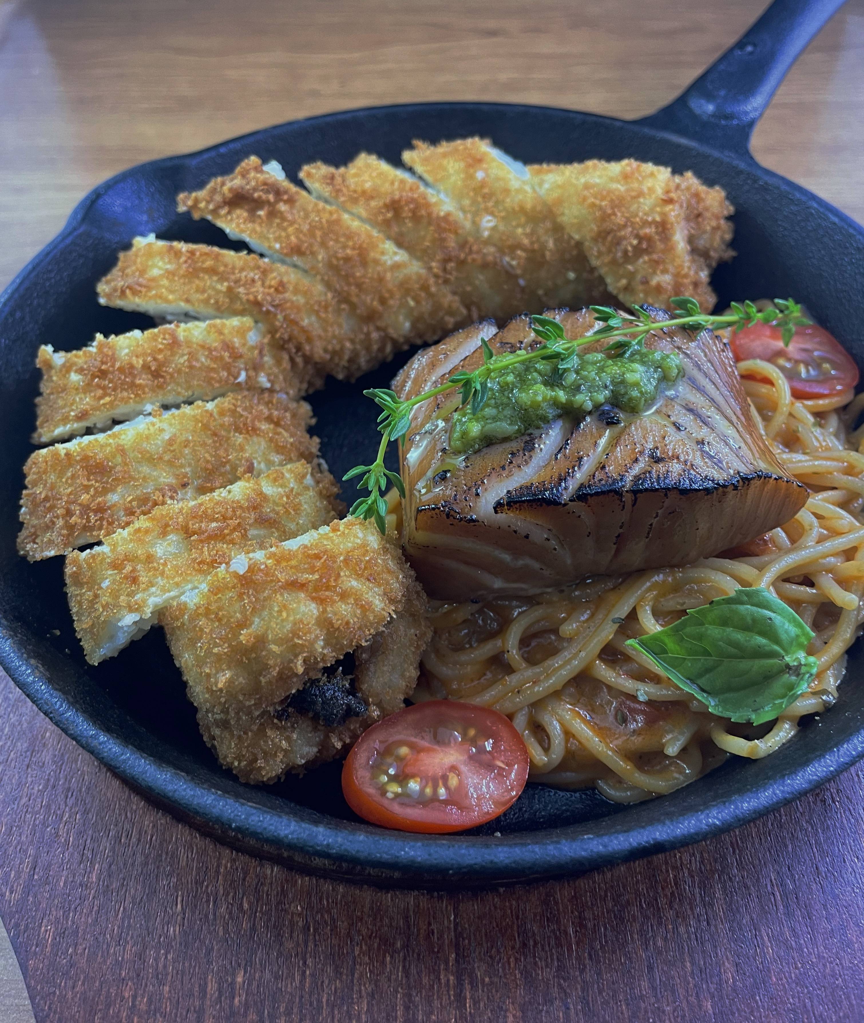 All boxes include 2 pcs Aburi roll, 3 pcs veggie tempura (yam and zucchini) Comes with soft tofu with ponzu, house salad, rice and miso. Lunch sized Salmon Steak on yam tartare with basil pesto