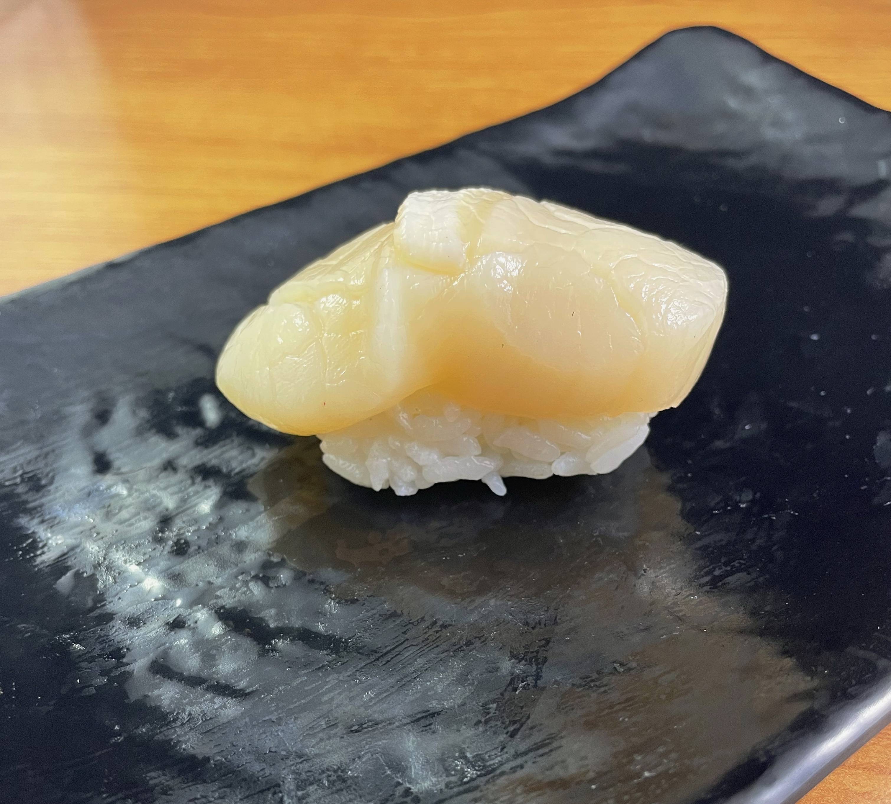 Roll with chopped scallops and spicy mayo. Covered with masago (smelt roe) on top.
