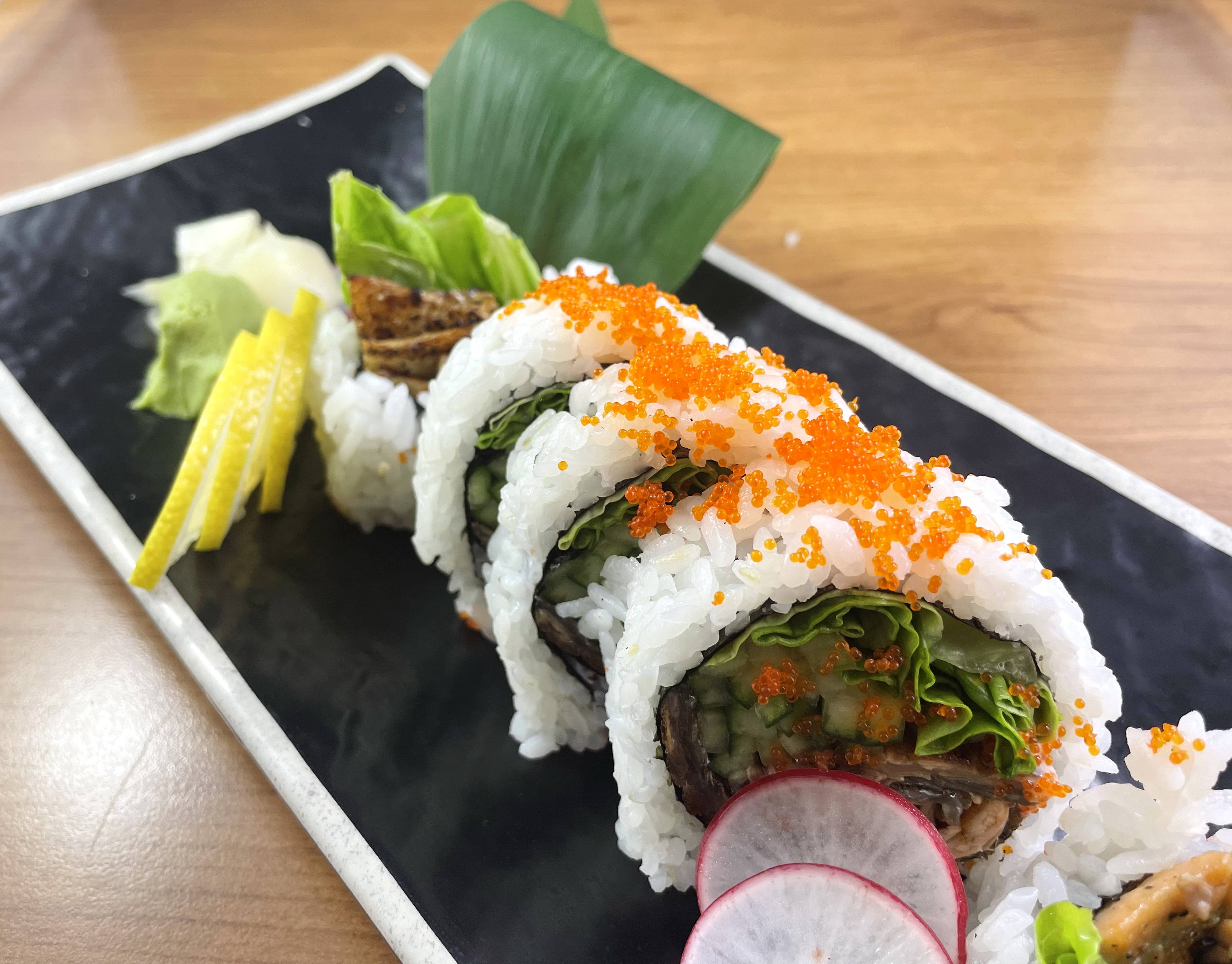 Roll with cooked salmon skin, lettuce, cucumber, mayo, and sweet sauce covered with masago (smelt roe) on top.