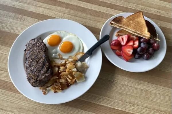 Served with hash browns, fruit salad, your choice of eggs & toast.