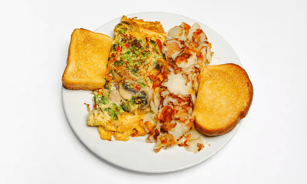 Broccoli, pepper, onion, mushroom.Served with hash browns, your choice of toast.