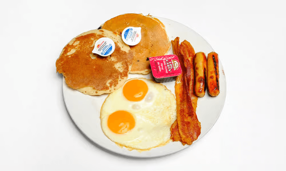 2 eggs, 2 pancakes, 2 bacon, 2 sausage