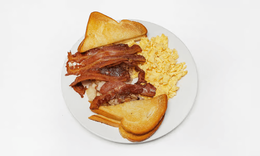 Bacon, pepper, onion, mushroom.Served with hash brown, your choice of toast.