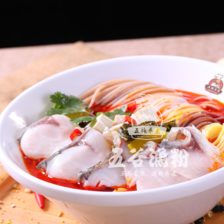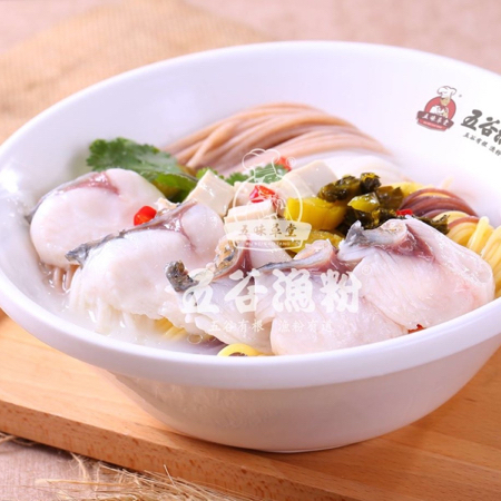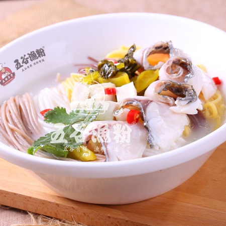 鲜鱼片,豆腐,酸菜,五谷粉,青菜,猪+鱼骨汤配辣小米酱