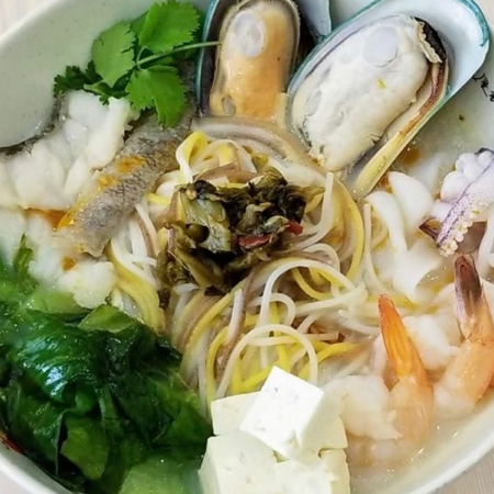 鮮魚片,蝦,青口,鮮尤,豆腐,酸菜,青菜,五谷粉,豬+魚骨湯