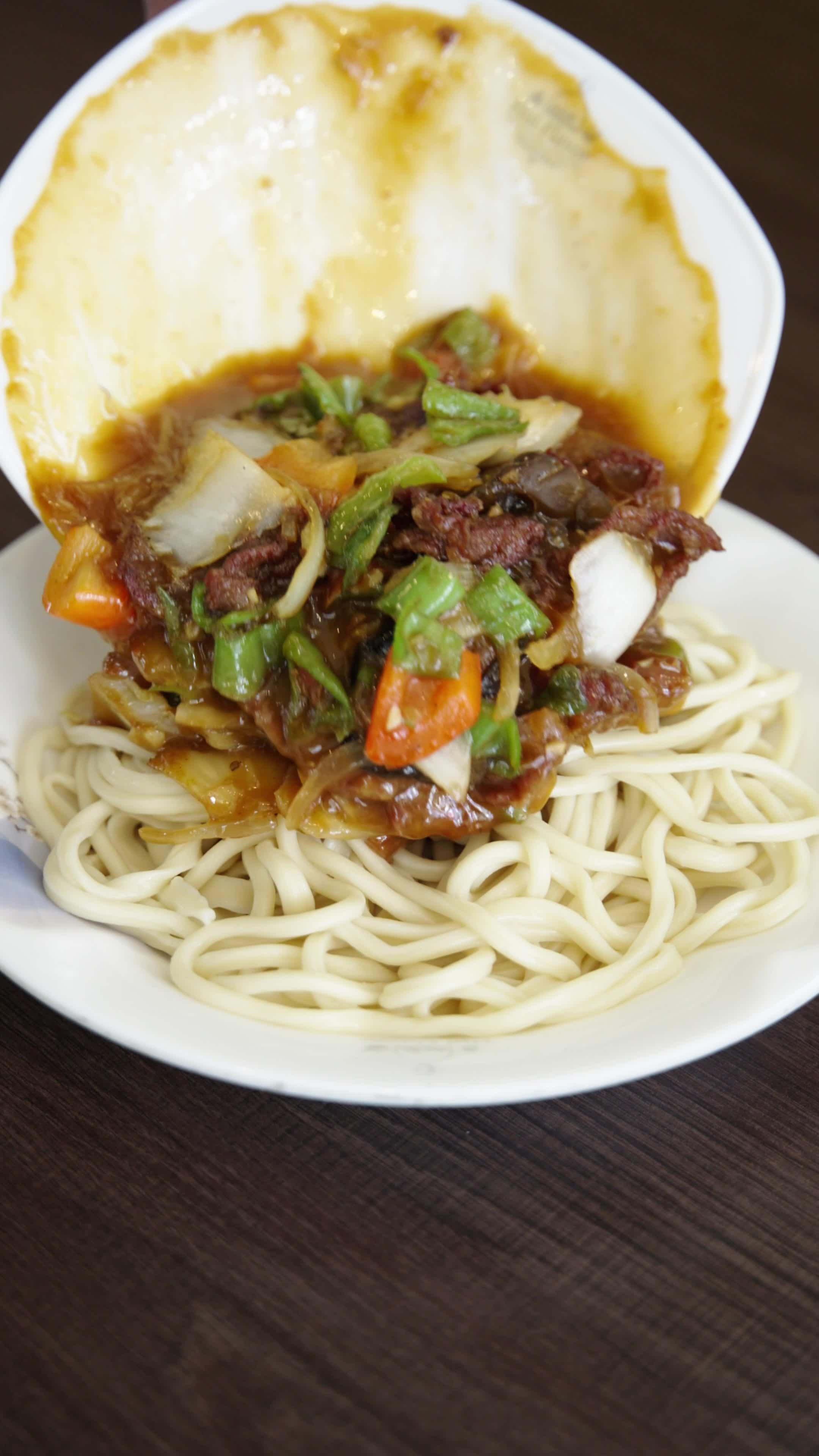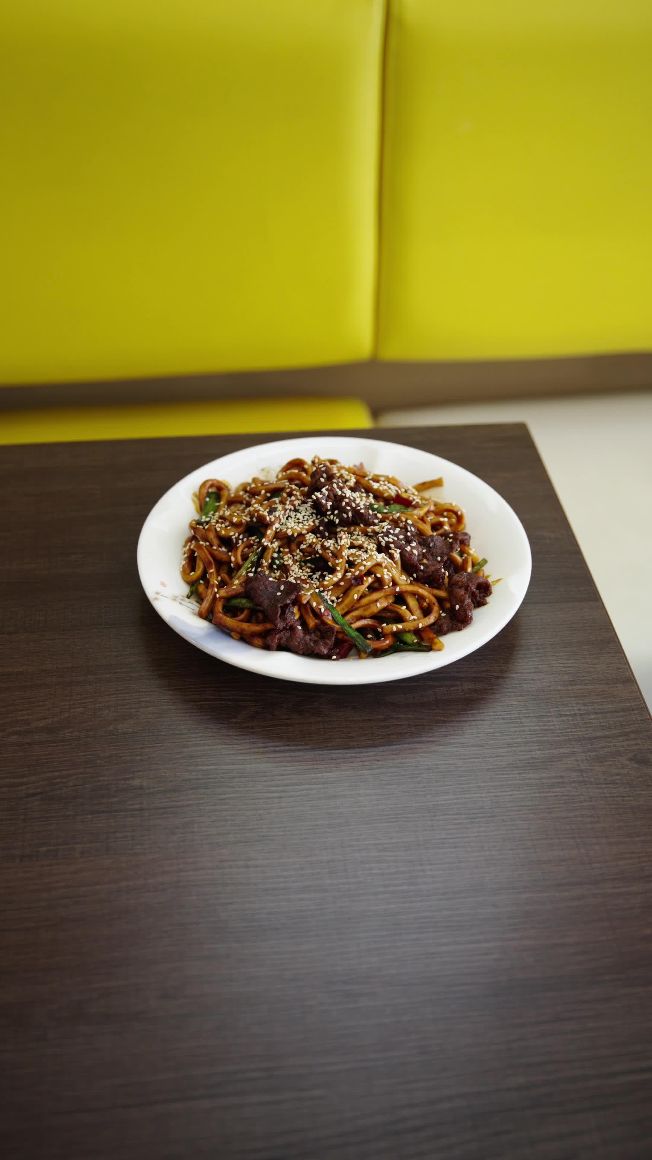 Dry-fried noodles with sliced beef, dried chilies, green onion, and sesame in a savoury sauce.