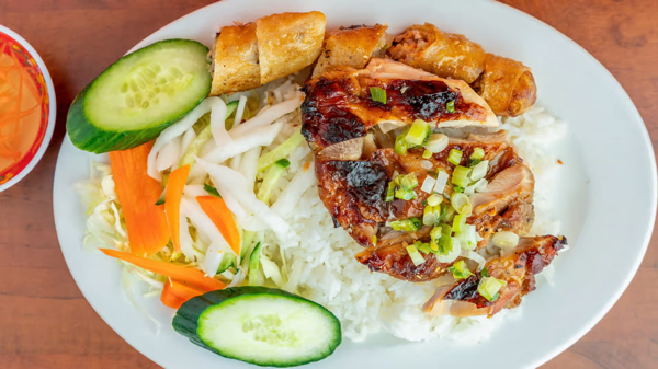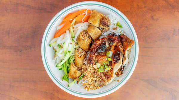 Lemongrass chicken and crispy spring rolls served with vermicelli noodles.