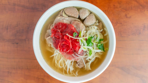 Steak, flank, meat ball, and tripe served in a comforting beef broth
