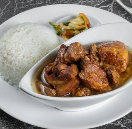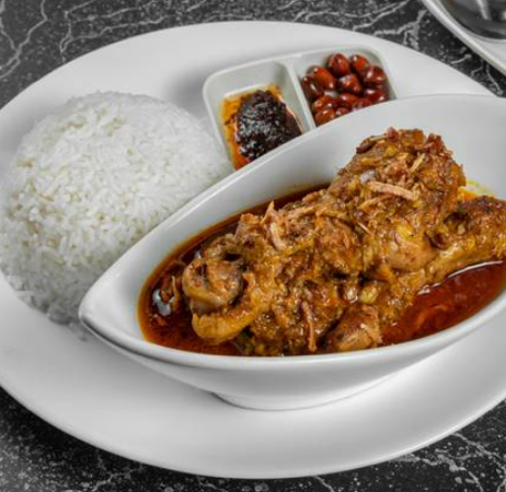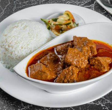 Slow-cooked marinated beef with coconut gravy and homemade special spice, served with rice.