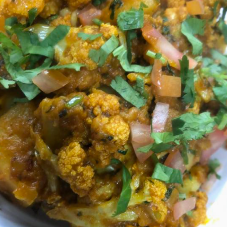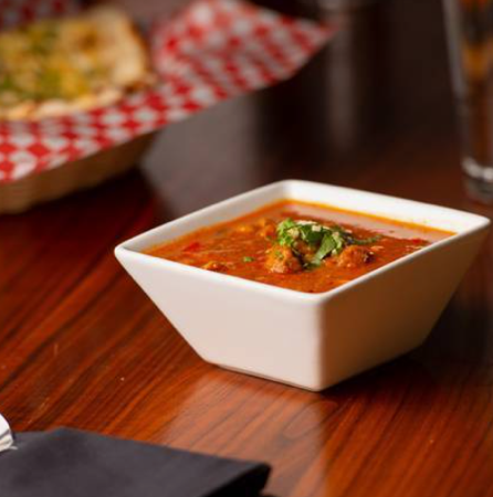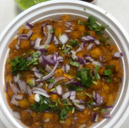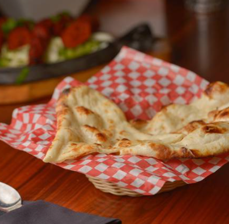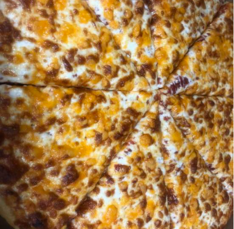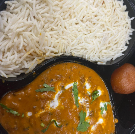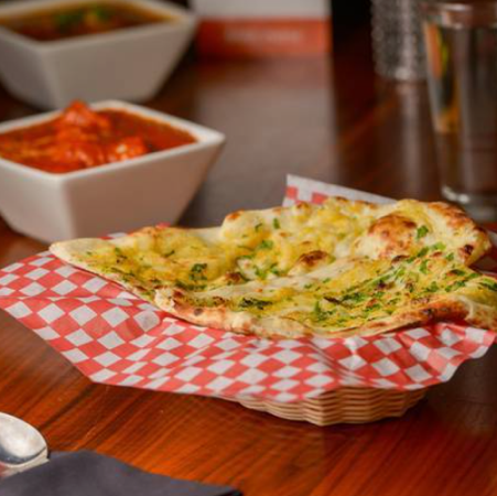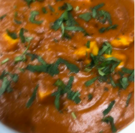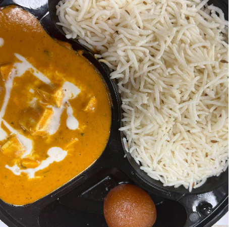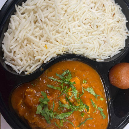 Shahi paneer sauce, onions, green peppers, paneer, and tomatoes. Mozzarella cheese