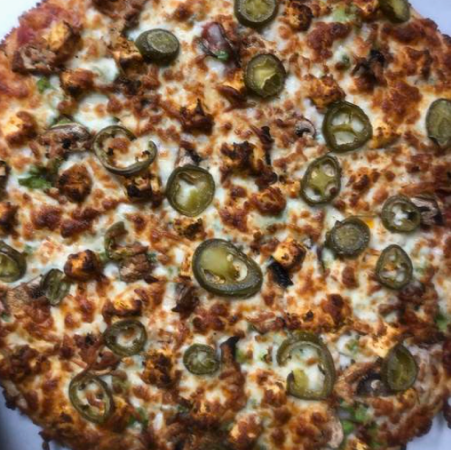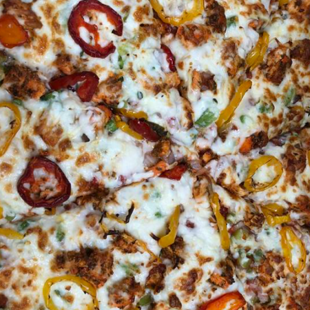 Tandoori chicken,onions, green pepper, banana pepper, cheese, and pizza sauce.