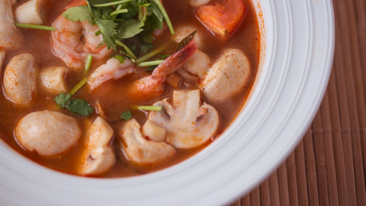 Hot and sour soup with prawns, mushrooms, lemon grass, tomato, and Thai spices.