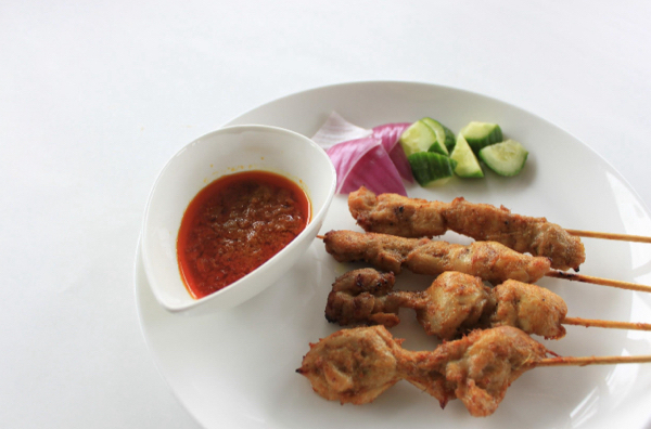 Marinated chicken or beef skewers served with peanut dipping sauce.