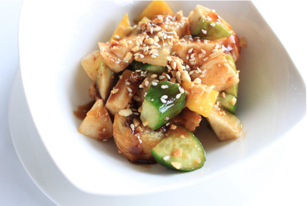 Hainanese steamed boneless chicken with cucumbers and soy sauce, served with ginger and chili garlic sauce.