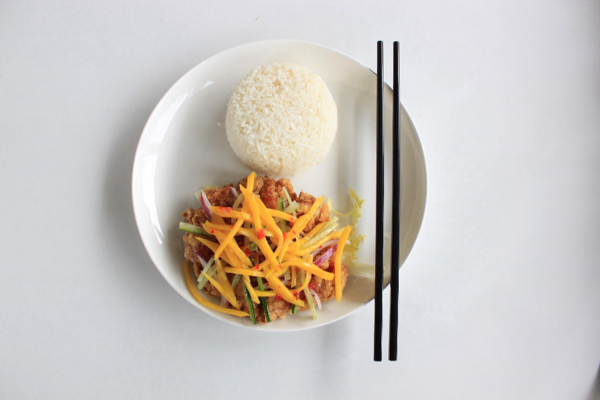 Deep fried breaded chicken topped with shredded mango, onions and sweet chili sauce. Served with a bowl of white rice.