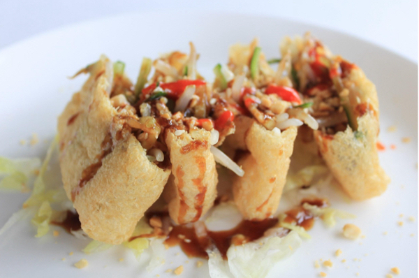 Grilled stuffed tofu with bean sprouts, cucumber and jicama shreds,lopped wiith crushed peanuts and sweet sauce.