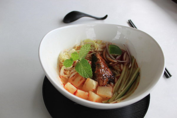 Laksa noodles with sardines, cucumbers, pineapple, onions, and mint leaves in hot and sour broth