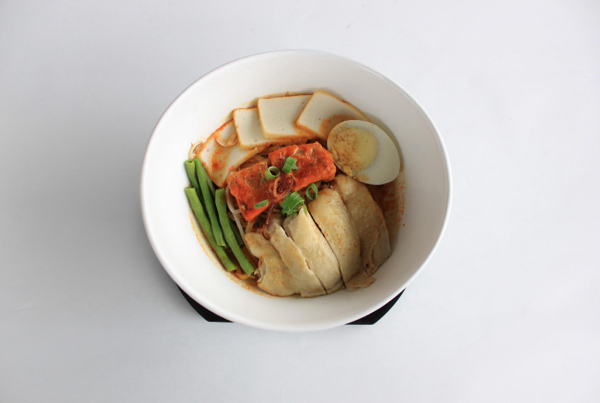 Yellow noodles and rice vermicelli with pork, vegetables, shrimps, fishcakes, and shrimp paste in authentic Malaysian shrimp broth.