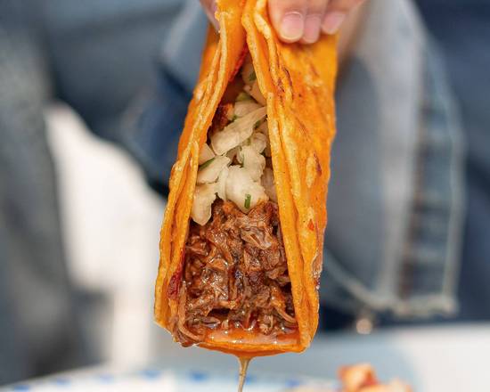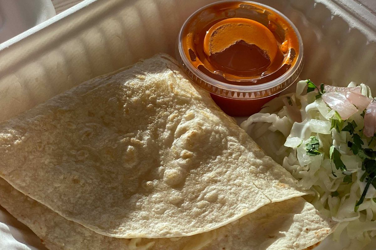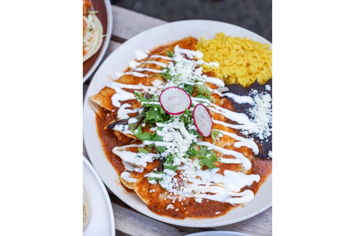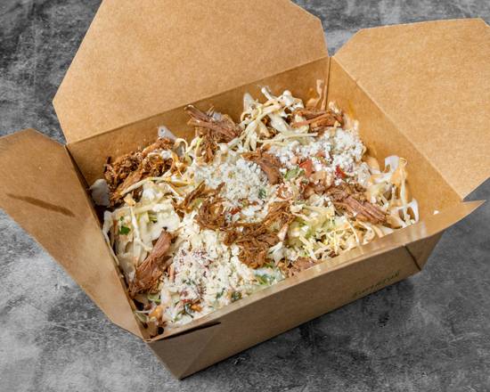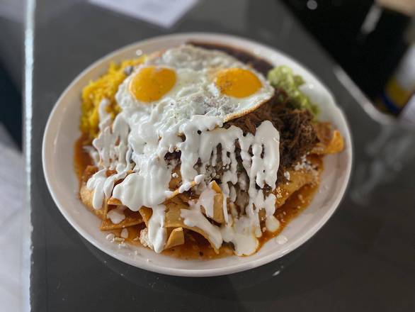 2 eggs, chorizo, rice, beans, coleslaw, chipotle mayo, pico de gallo, mozzarella cheese wrapped in 12 inch flour tortilla topped with mozzarella cheese, covered with hot red salsa and green salsa, sour cream and feta cheese.