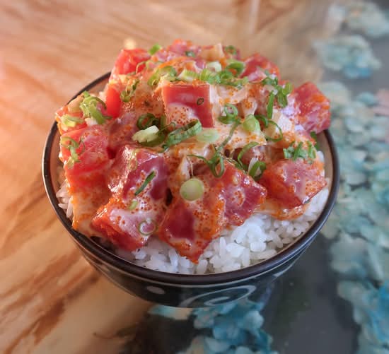 Creamy Shoyu Ahi Tuna with capelin roe and green onions, on white rice.