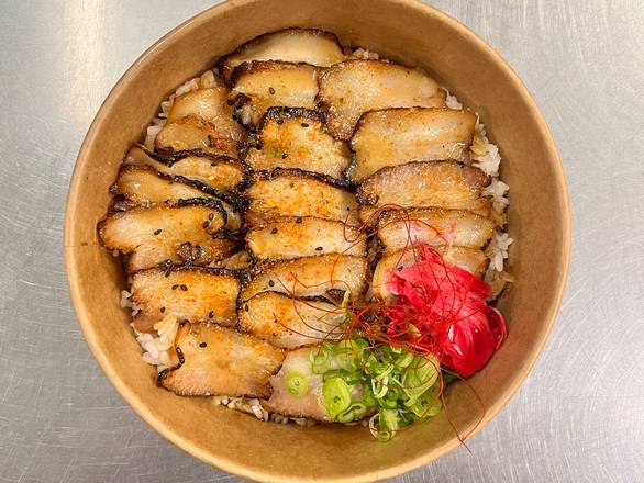 A hearty bowl with braised beef, green onions, pickled ginger, and seaweed flakes on rice