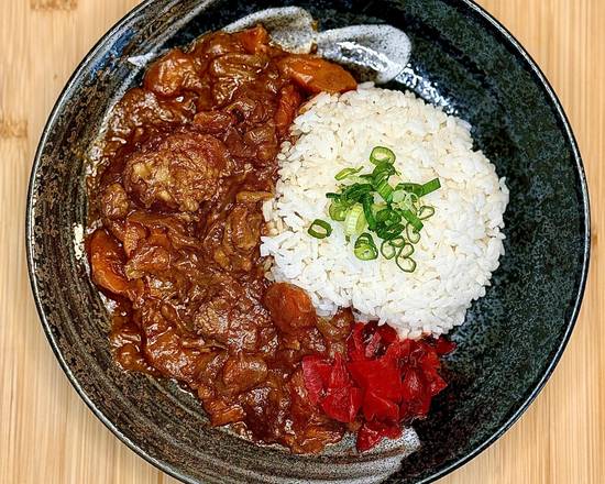 Rich curry with chunks of pork and carrot, served with fukujinzuke